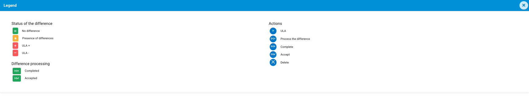 In the Actions column, if you click on the icon labelled “Process of the difference”, it means that you are accepting the reported difference. This action confirms your acknowledgment and approval of the stated discrepancies.