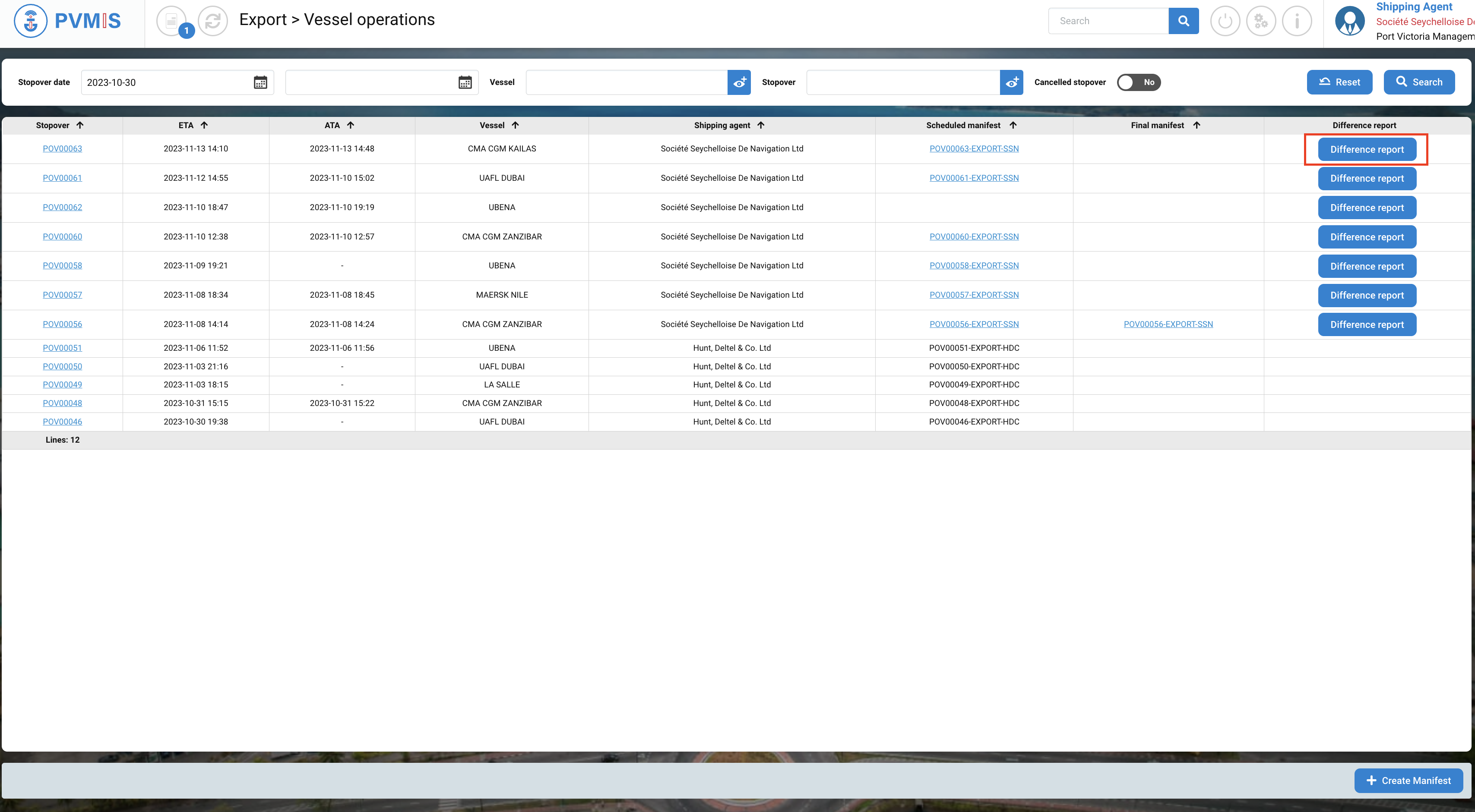 A list of all stopovers corresponding to the date range is displayed. Click on Difference report on the associated stopover.