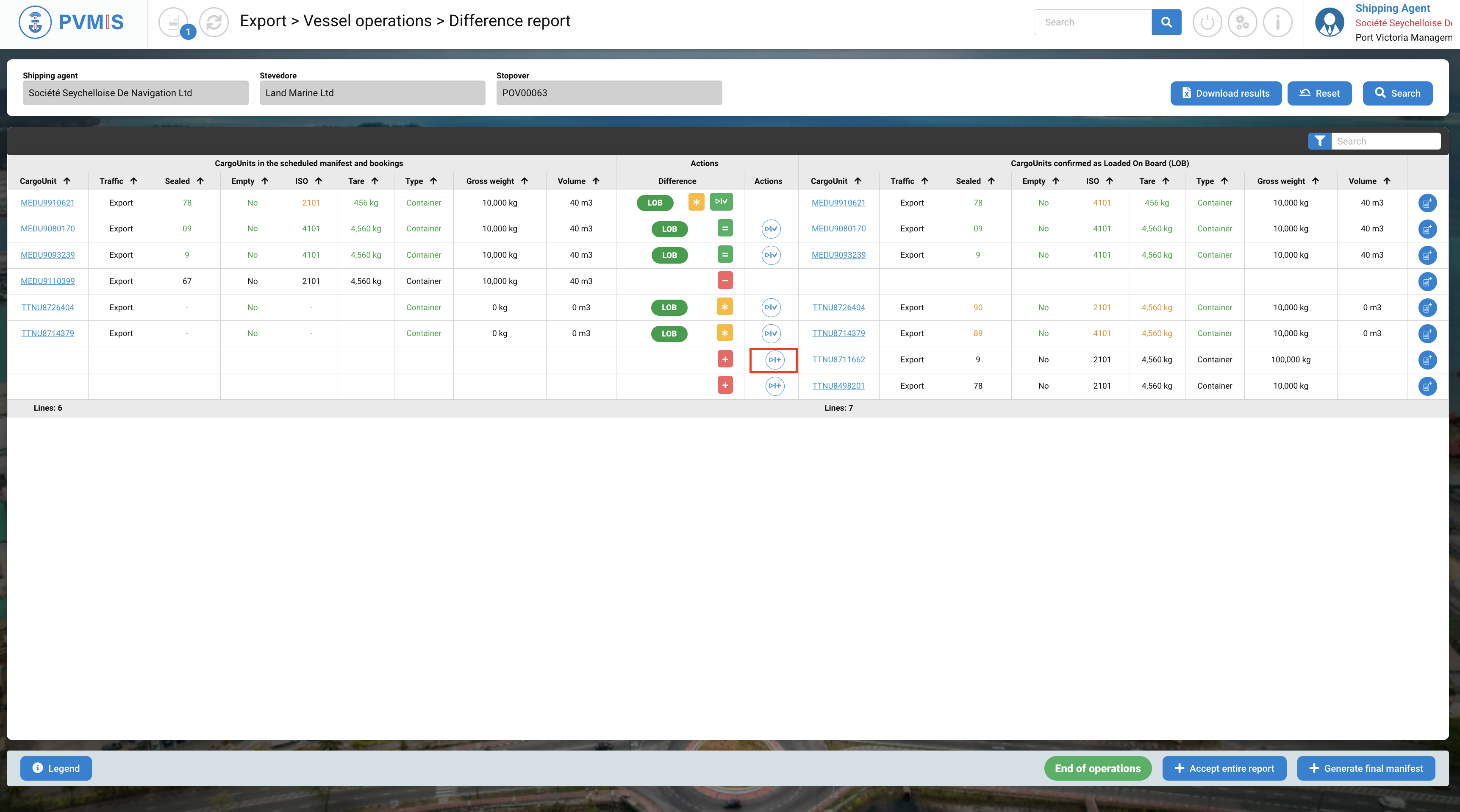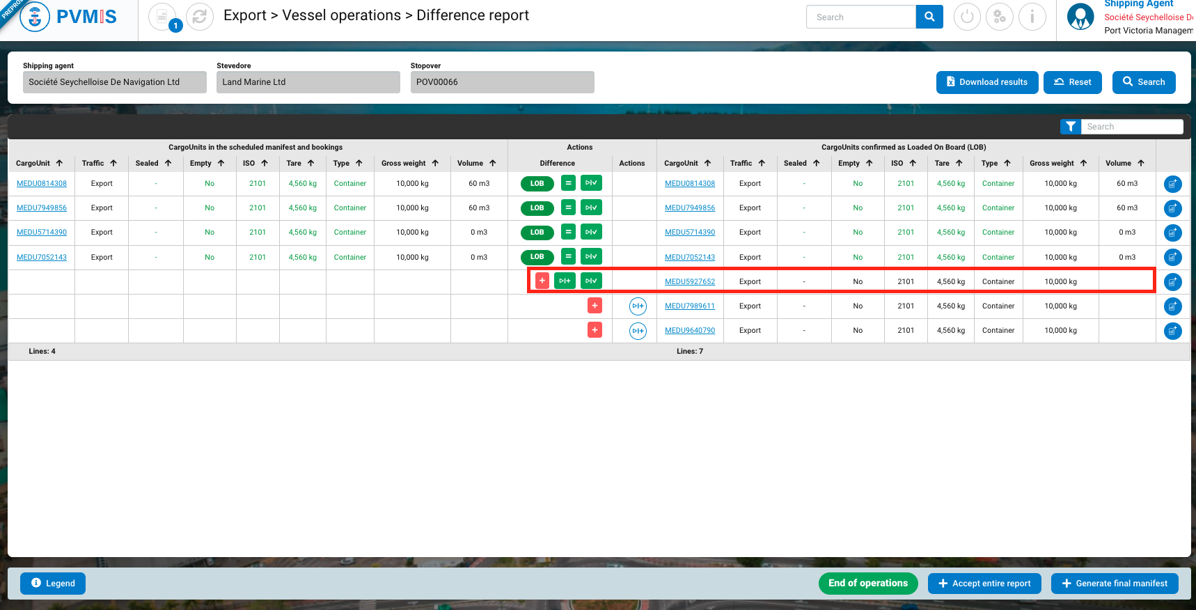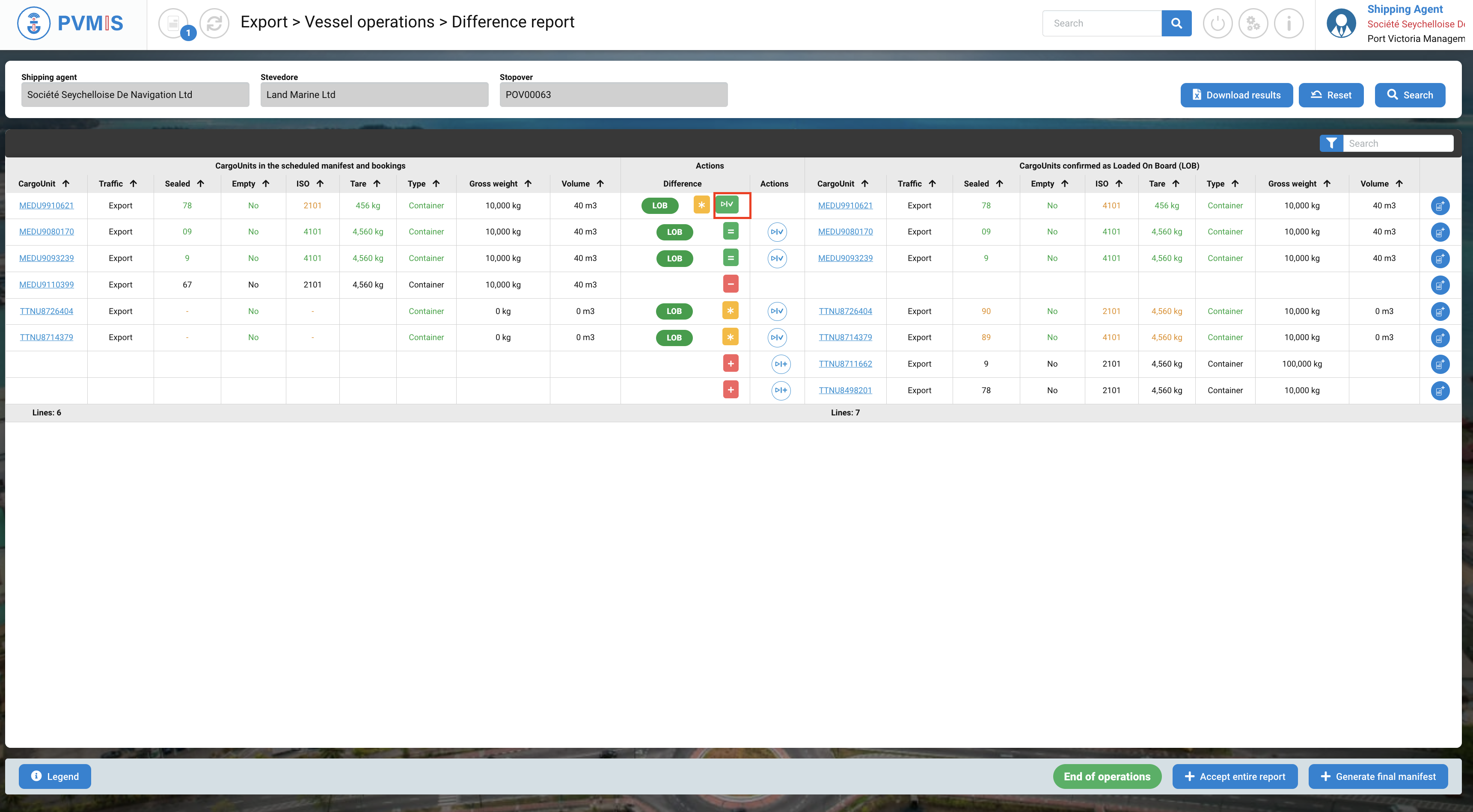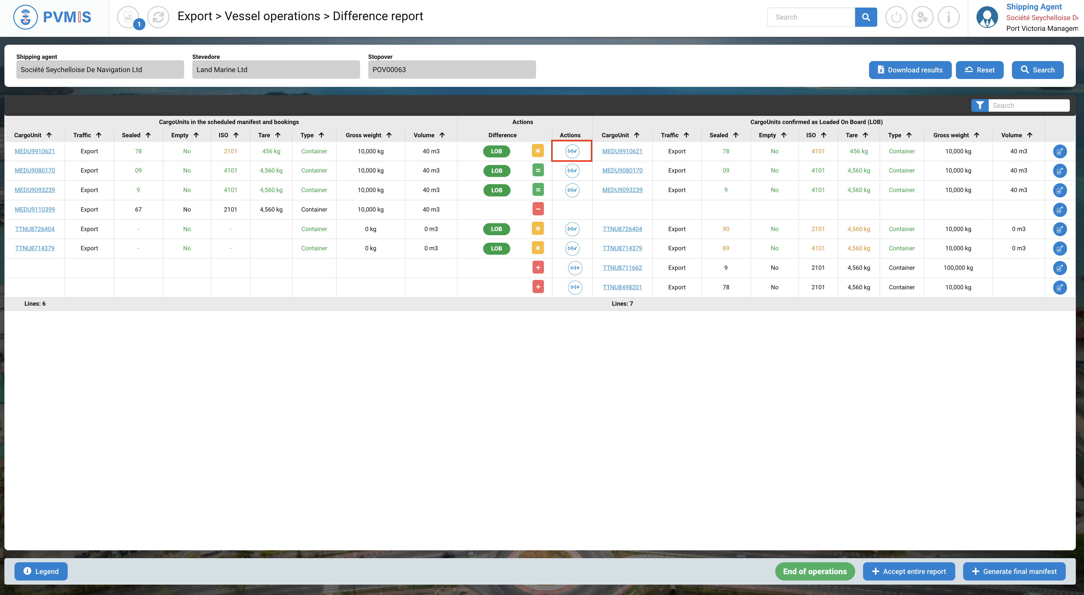 Upon redirection to the difference report as a shipping agent, your task is to accept all differences that have been declared by the stevedores. These differences will be highlighted in orange, while the corresponding information will be displayed in green. To understand the possible actions to accept differences, you can click on the "Legend" button, which will provide guidance on how to proceed with accepting these differences.