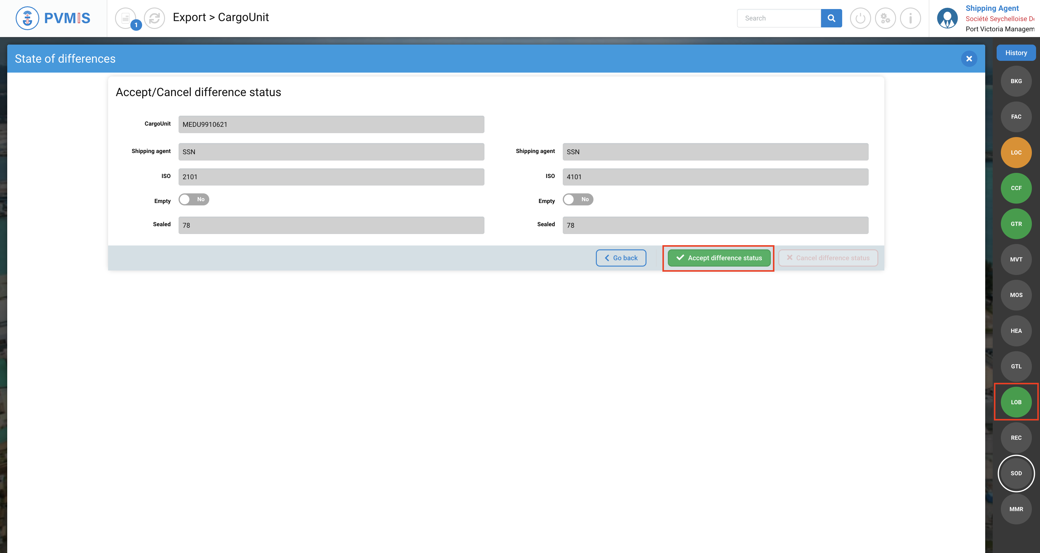 After clicking on these icons, you will be taken to the difference form for each CargoUnit. On the right-hand side of the screen, you can view the statuses of a CargoUnit. You can see that the CargoUnit is marked as Loaded On Board (LOB). This means that it has been correctly loaded.