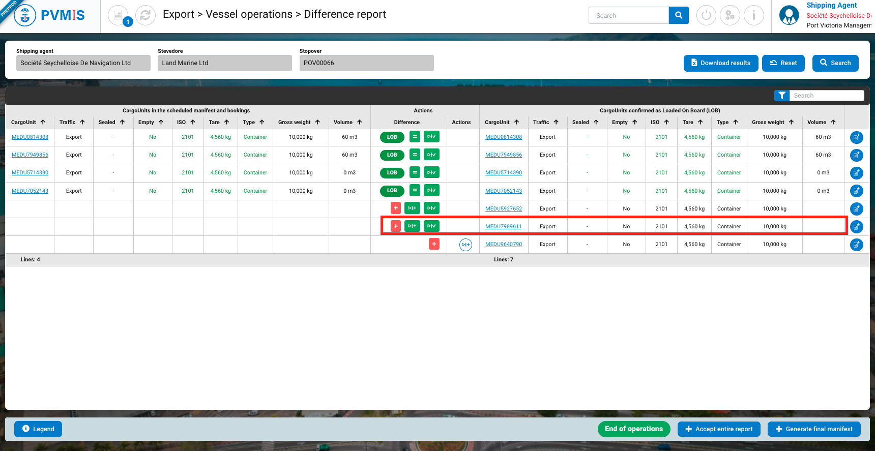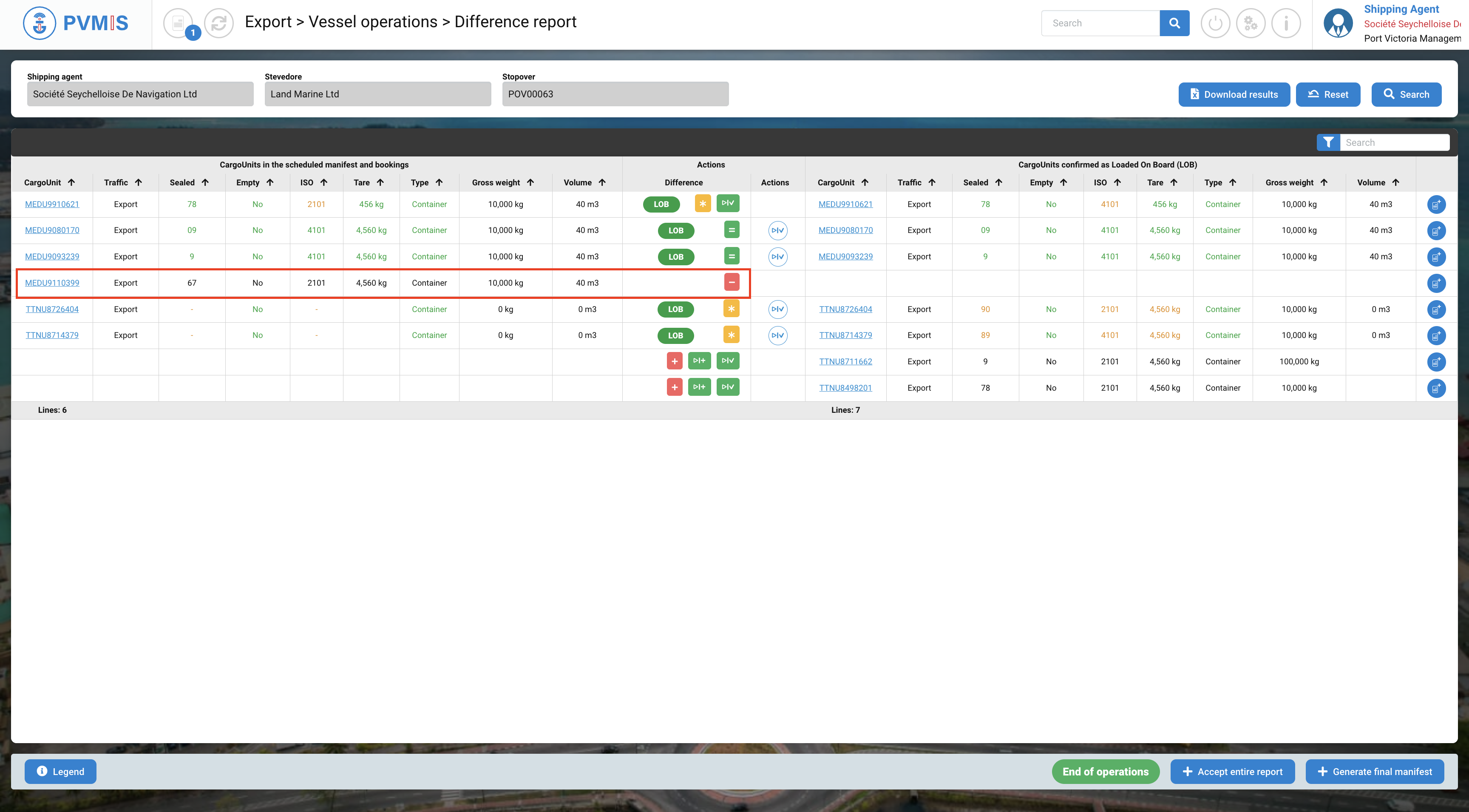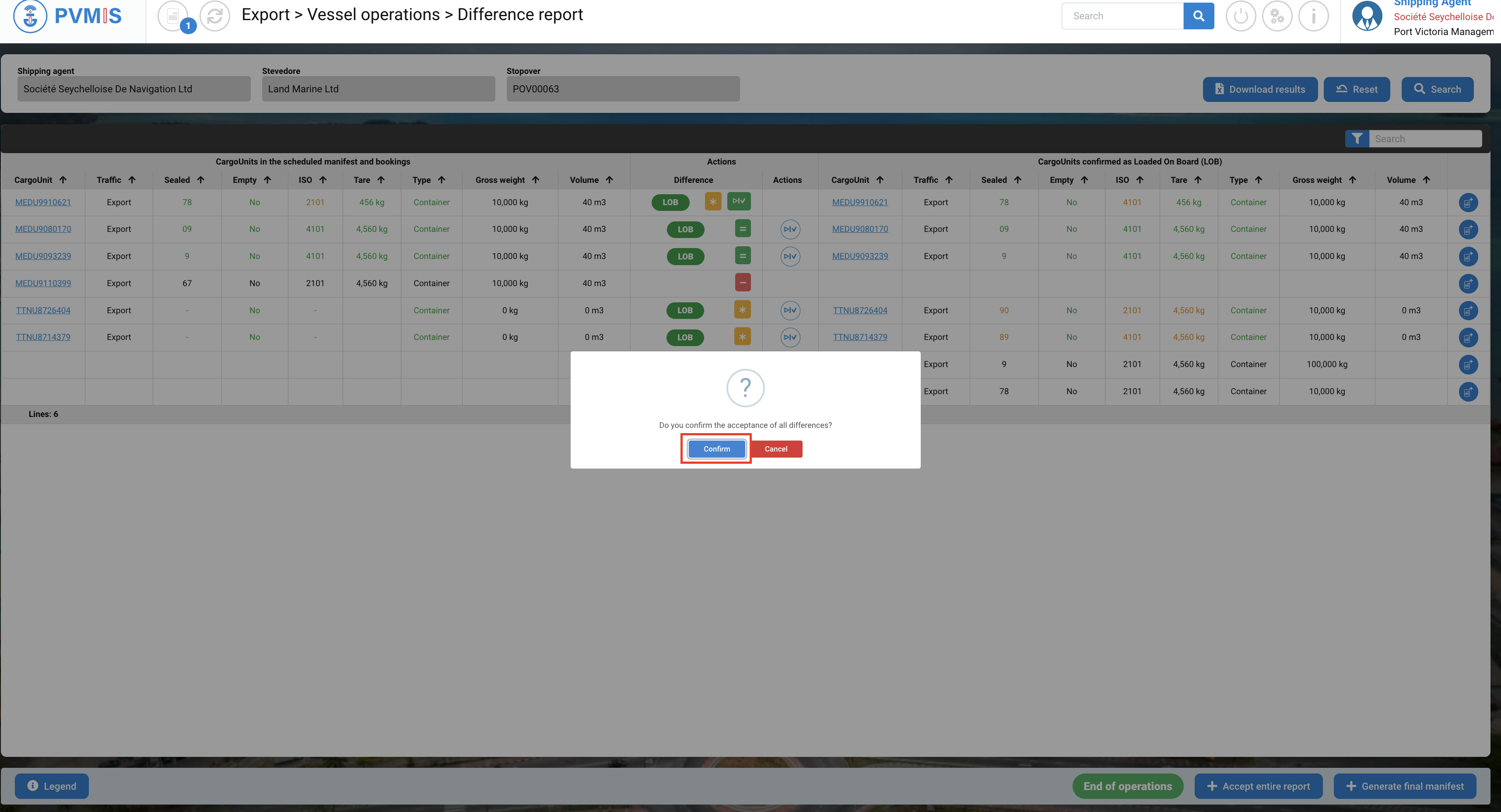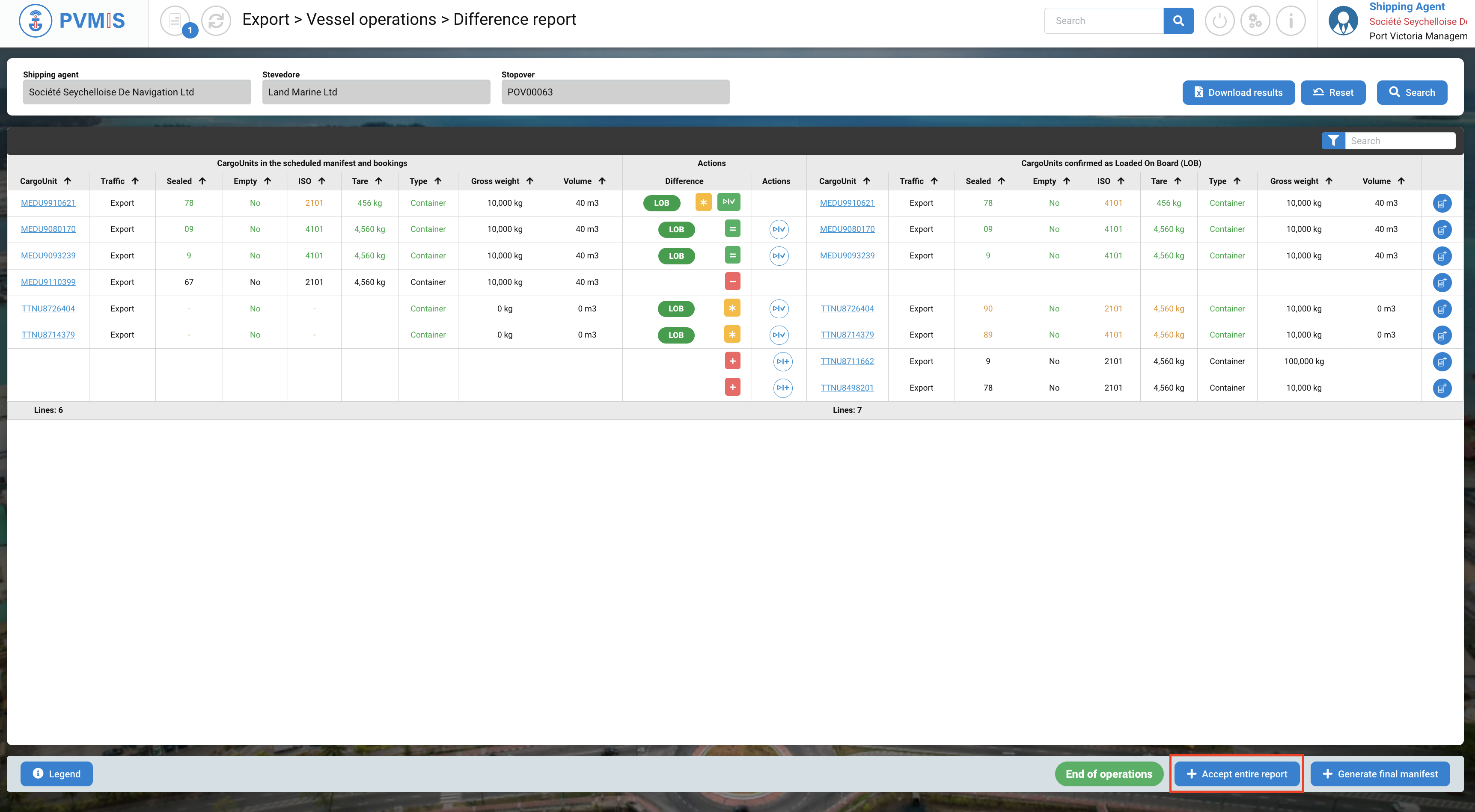 You can accept the differences for each CargoUnit or Accept the entire report by clicking on the button at the bottom of the screen.