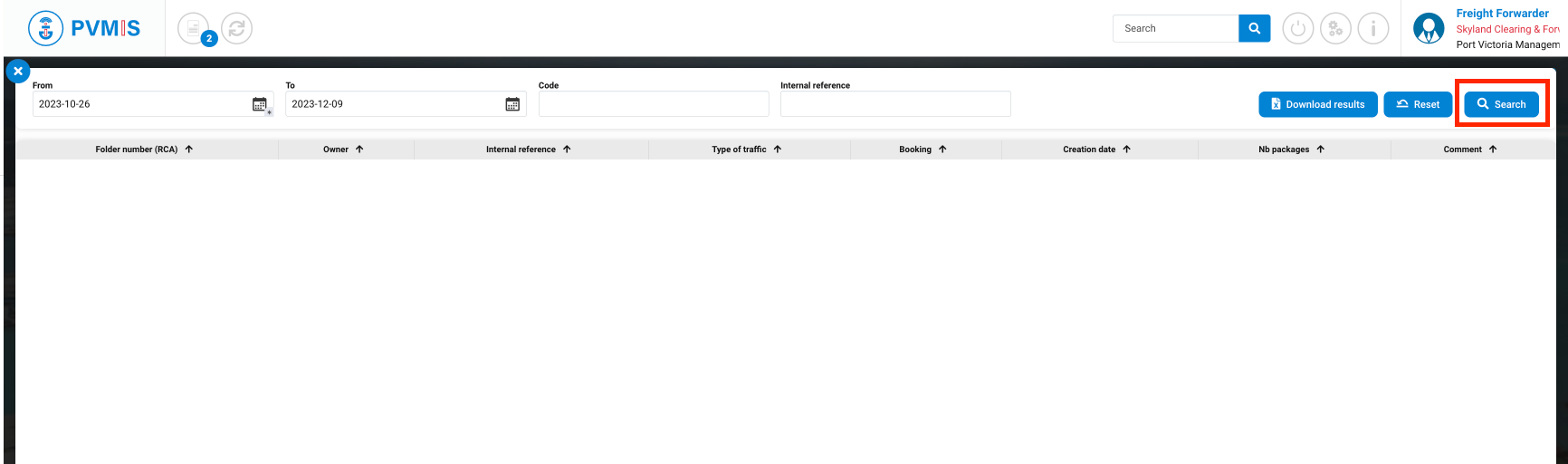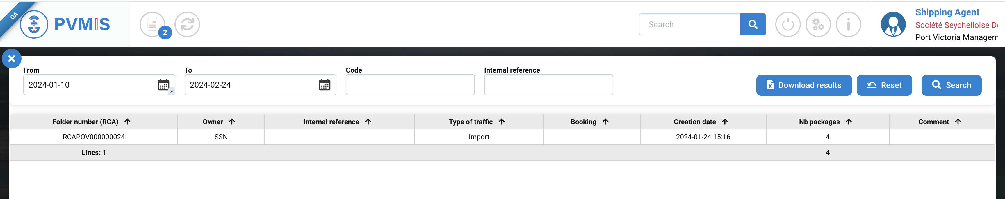 You can enter the declaration number of the corresponding folder (RCAXXXXX) or searche the folder by click on eye icon: