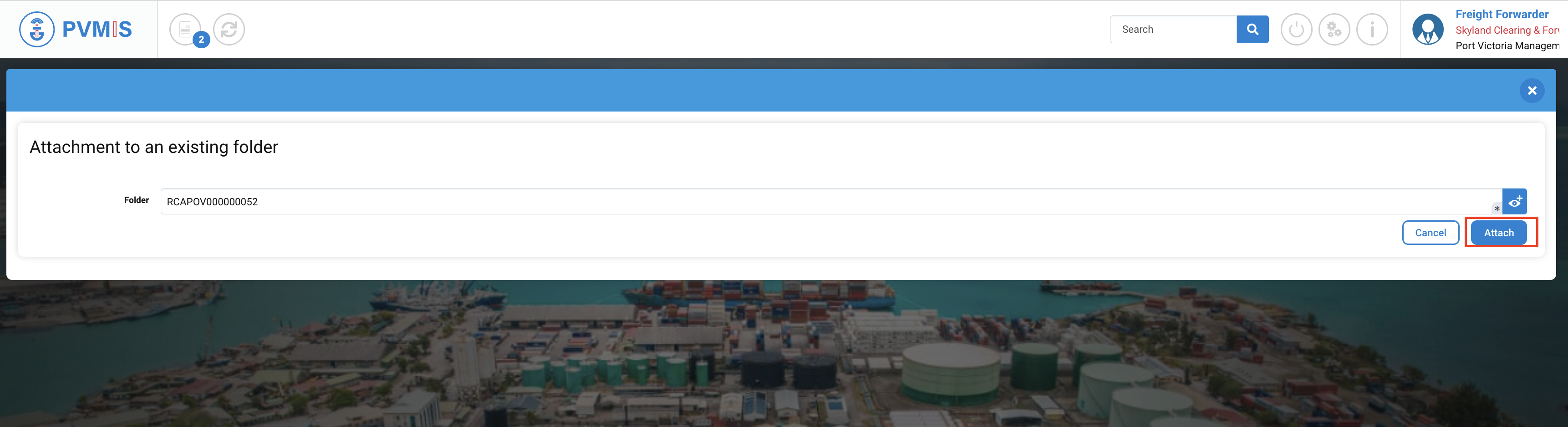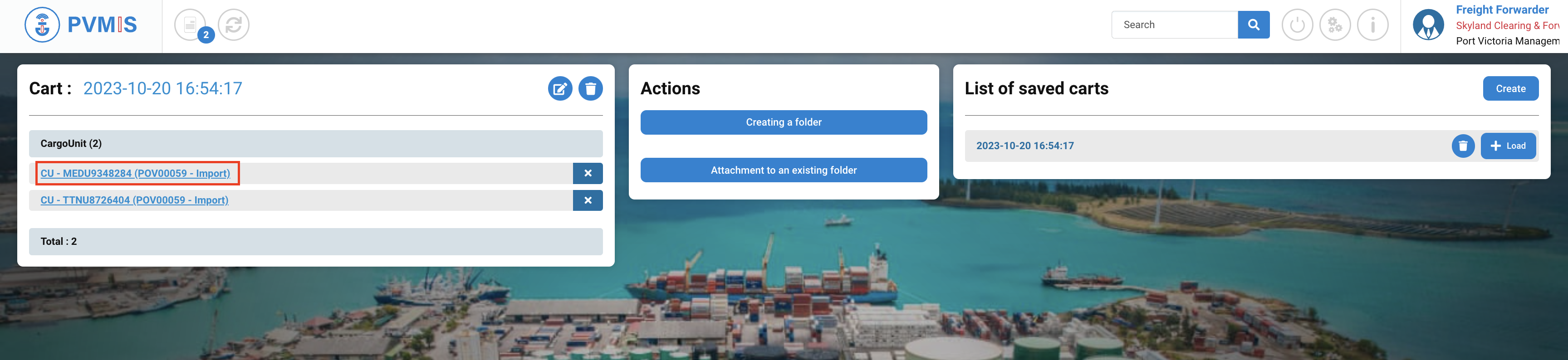 In the Cart, you can see in the left column the presence of the both CargoUnit entities, and on the Actions column click on Attachment to an existing folder button: