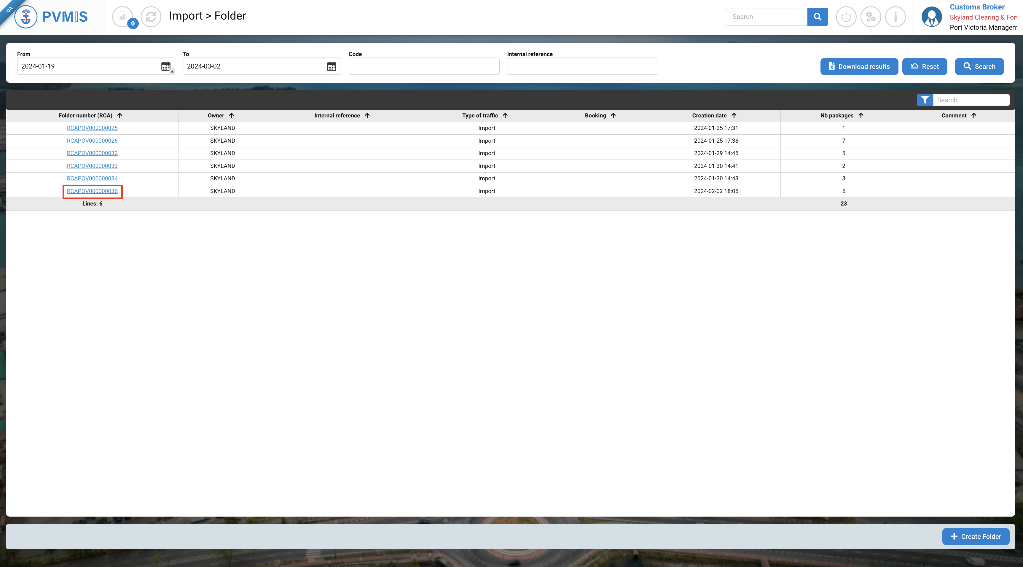 The list of folders created by the connected customs broker is displayed. Please click on the corresponding folder number (RCA).