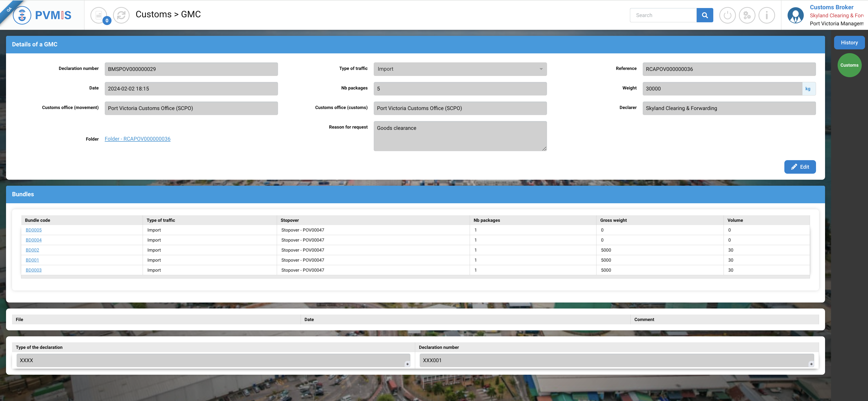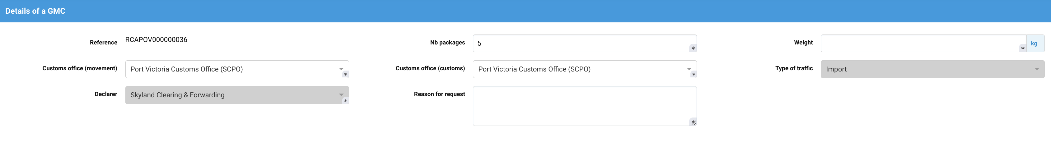 Customs office (movement)* | Pre-filed and by default is Port Victoria Customs Office (POV). |