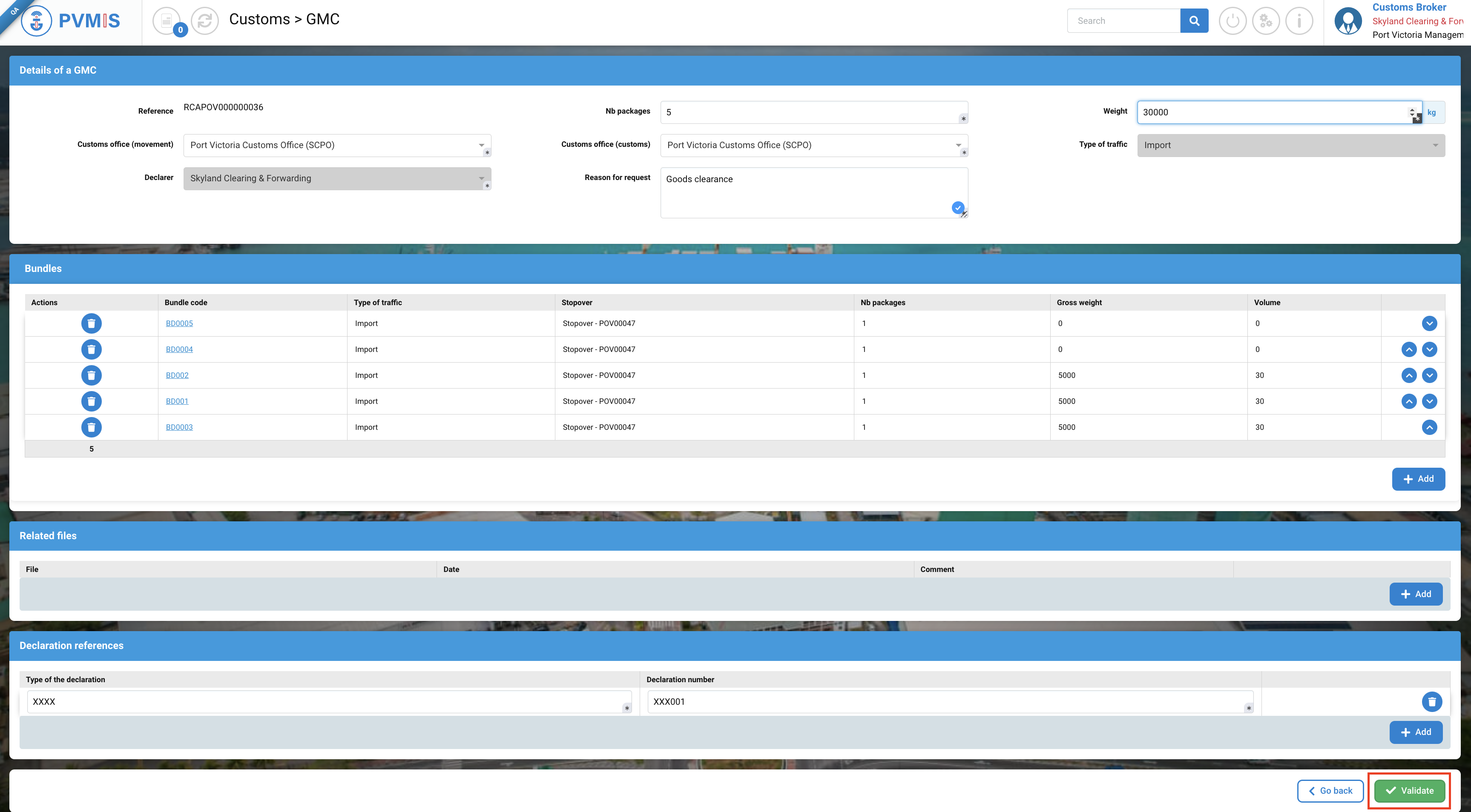 The Goods Manual Clearance (GMC) is created, and the formality will be directly validated. Your goods are cleared through customs and can leave the terminal.