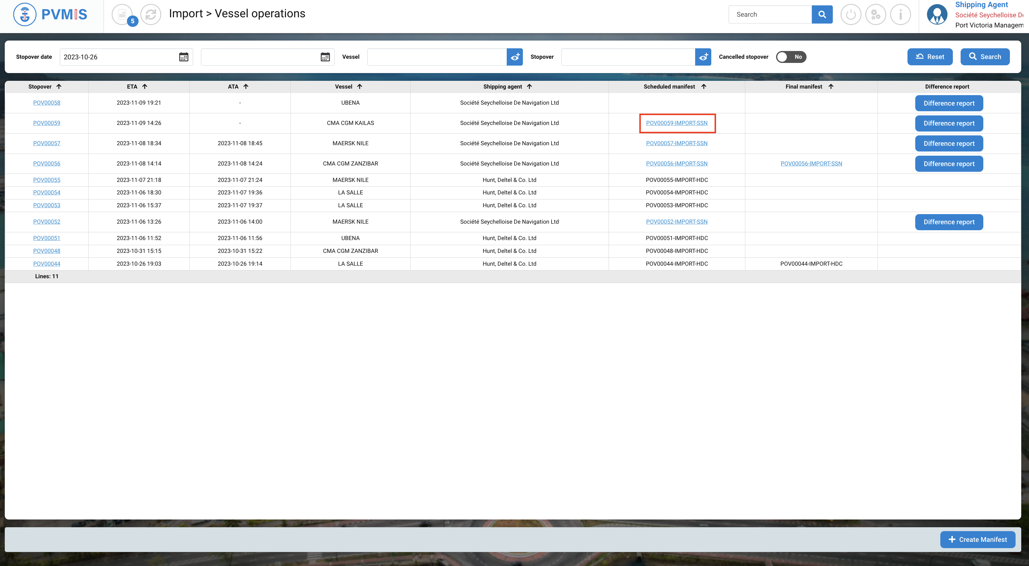The list of stopover is presented, click on the Scheduled manifest link corresponding: