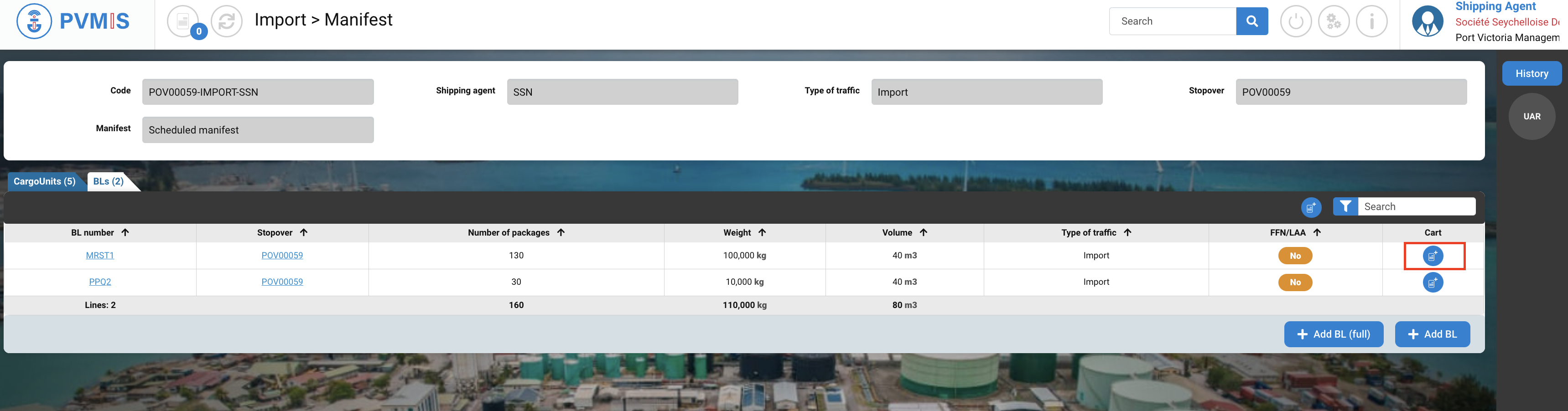 The list of BLs present in the scheduled manifest display, choose the BLs on which you want to assign them to the same freight forwarder, by clicking on the Cart icon to the right of the table.