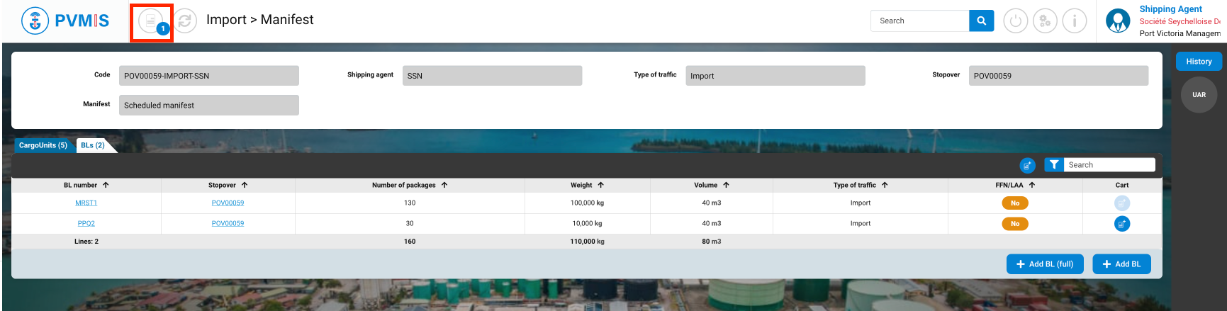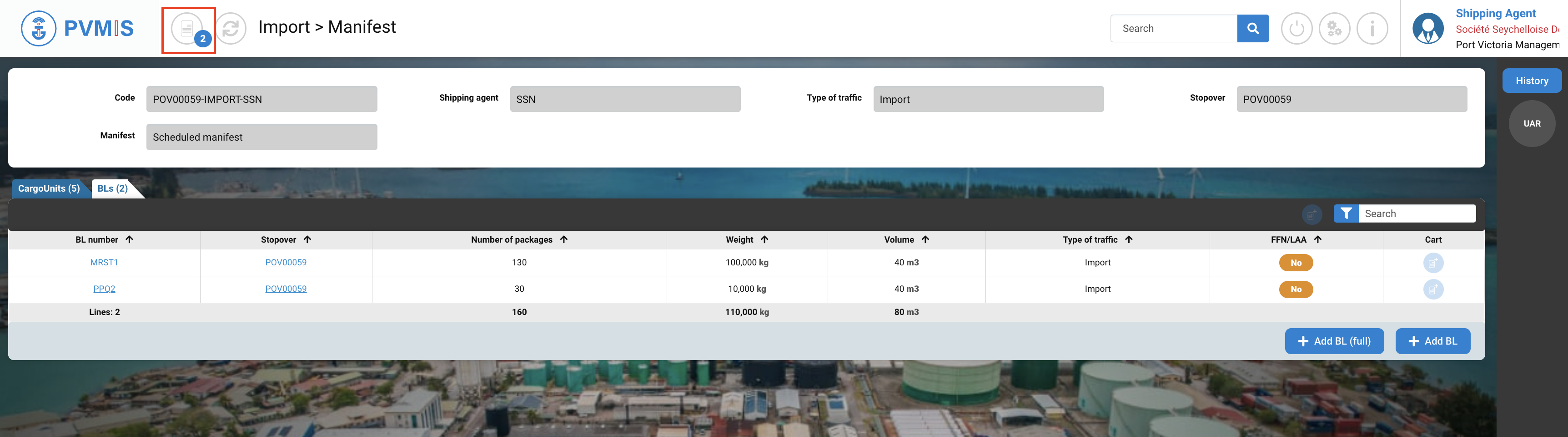After clicking on the Scheduled manifest link, you can consult the scheduled manifest, and click on BLs section: