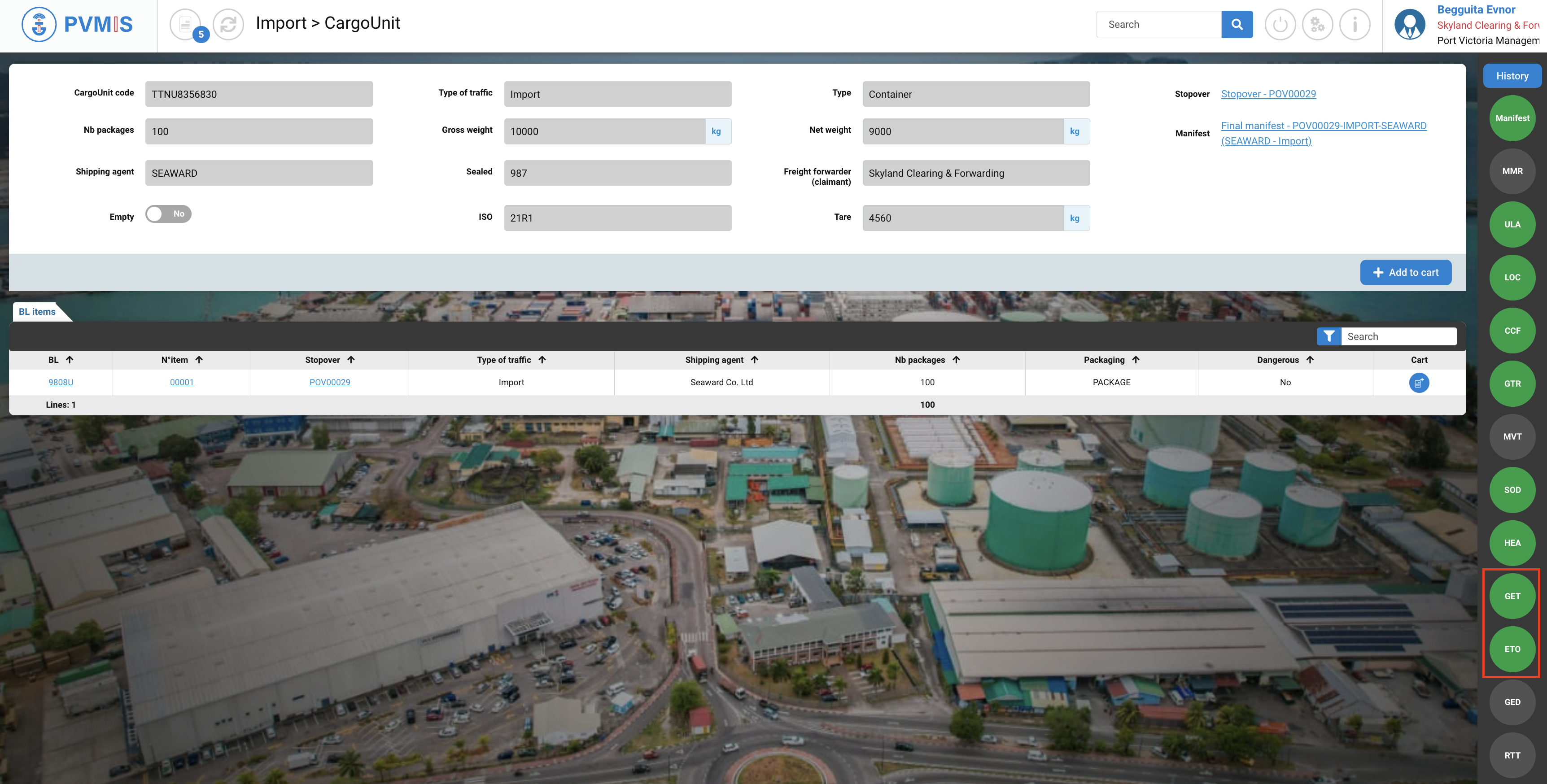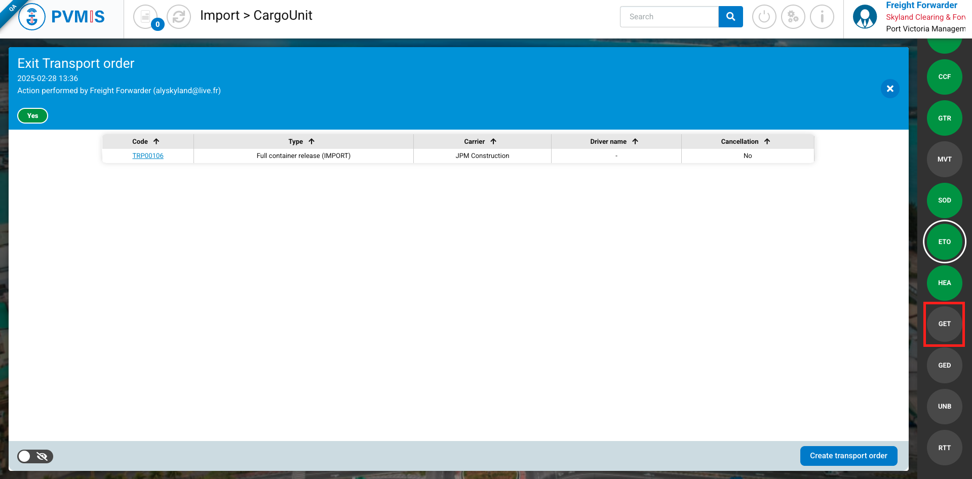 Once the transporter's information is completed, this Cargo Unit will obtain its terminal exit authorization (GET status in YES state).