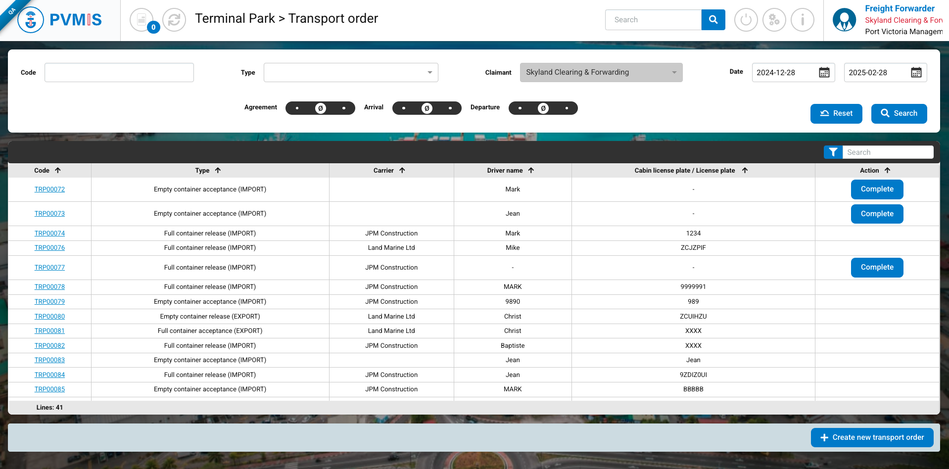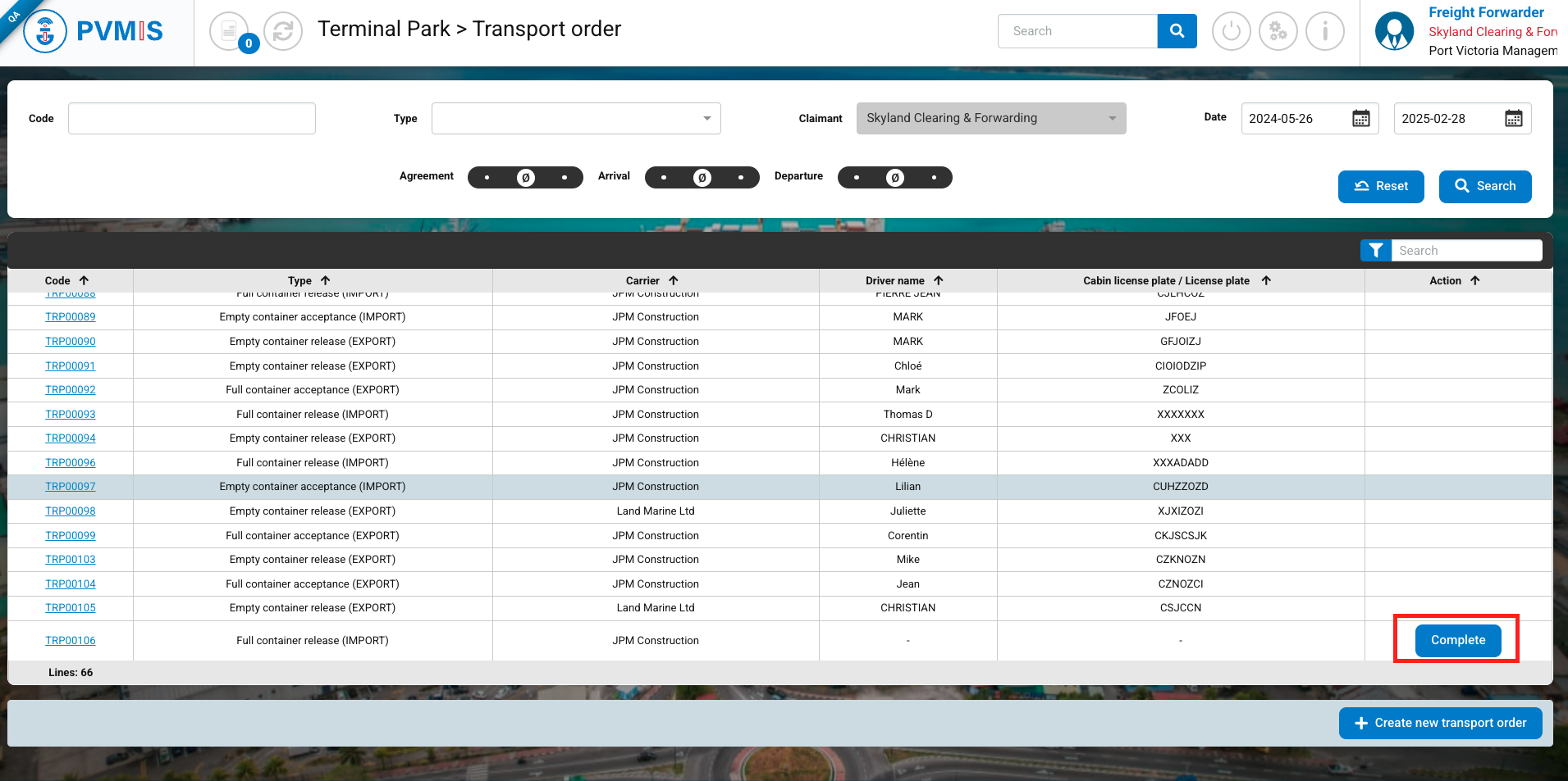 Action : In this column, action buttons can be displayed. When logged in as a Claimant, if the transporter's information (Driver code, Driver name, Cabin license plate) has not been filled in, the Complete button will be shown. By clicking this button, the user will be redirected to the transport order editing form to complete the information. This action can also be performed by a Carrier role holder with their company name listed on the transport order as the transport company.