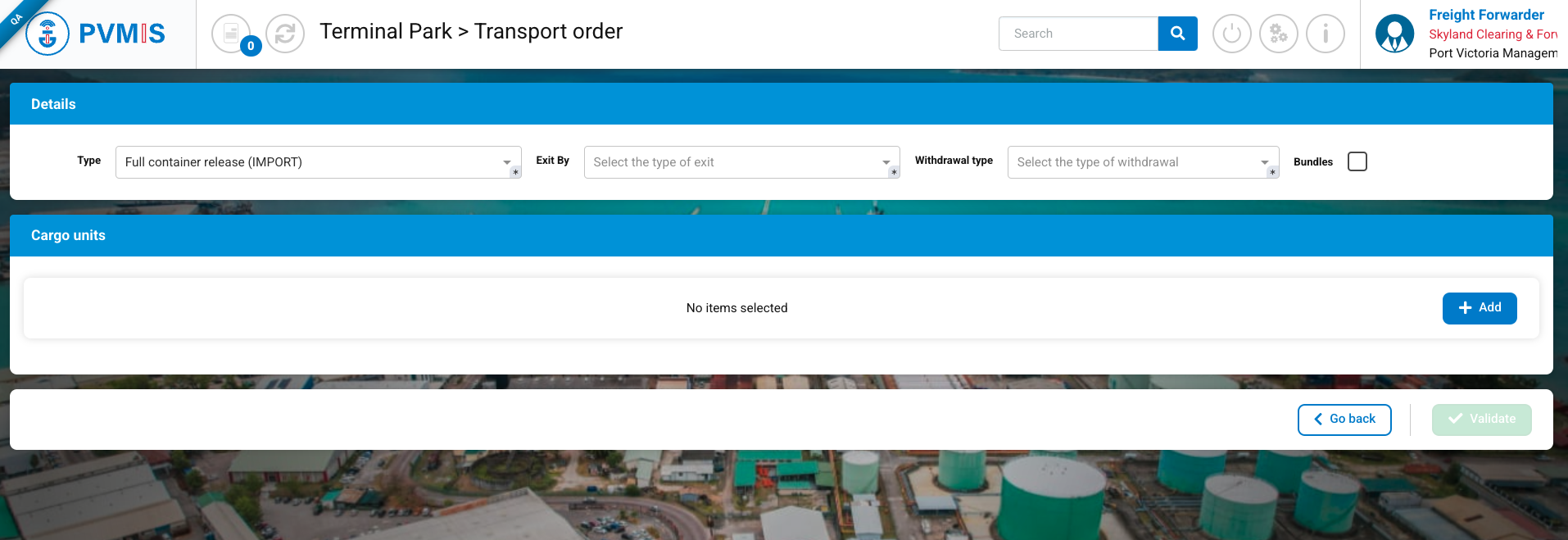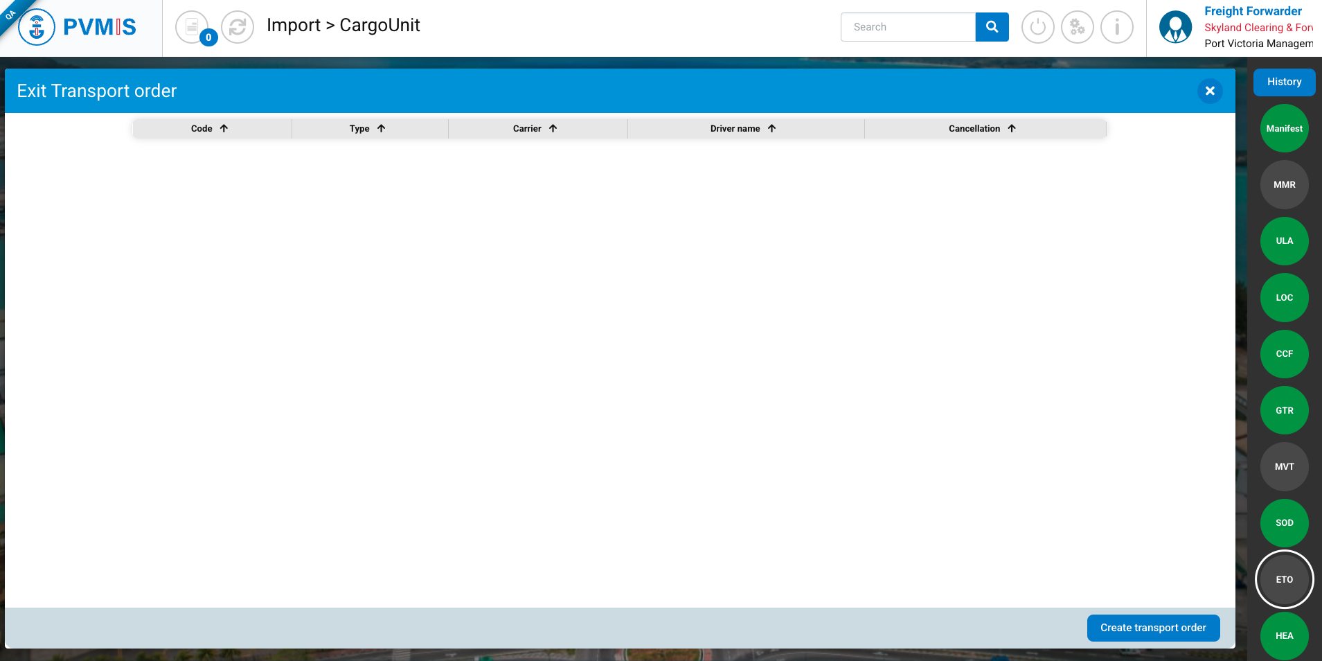 To create a Full container release (IMPORT) transport order, click on the Create transport order button and you will be redirected on the transport order creation form.