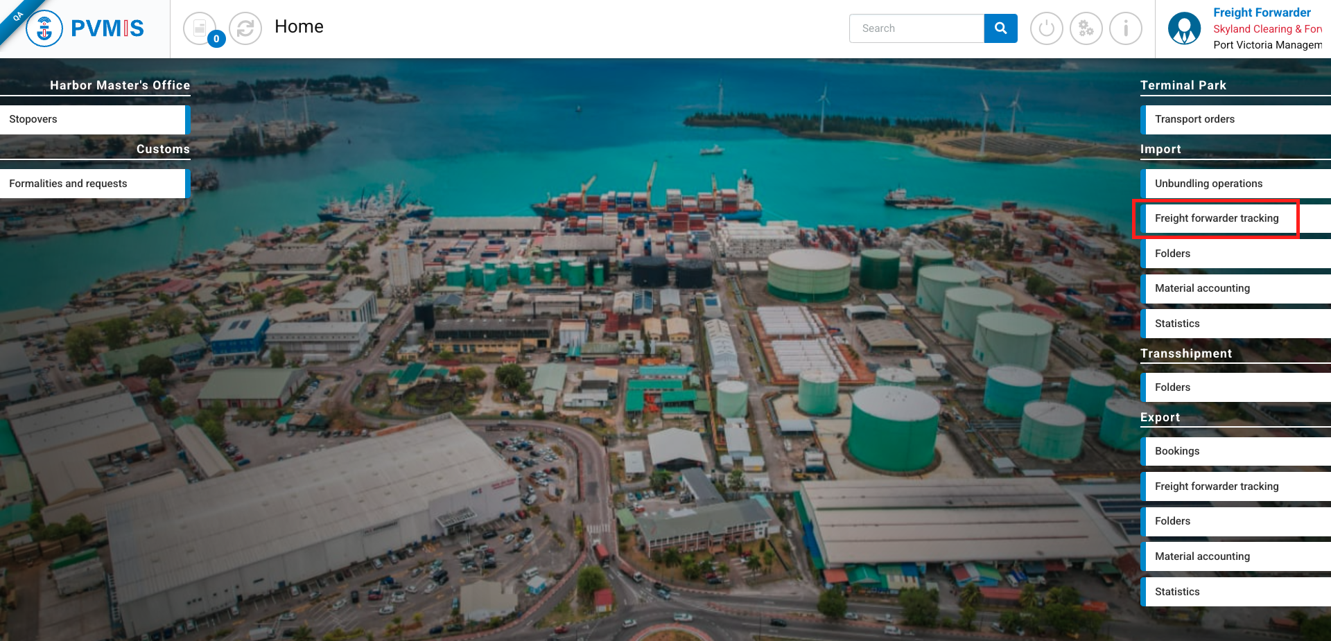 Connected as a Claimant role, from the Home page, click on “Freigh forwarder tracking” menu in Import section.