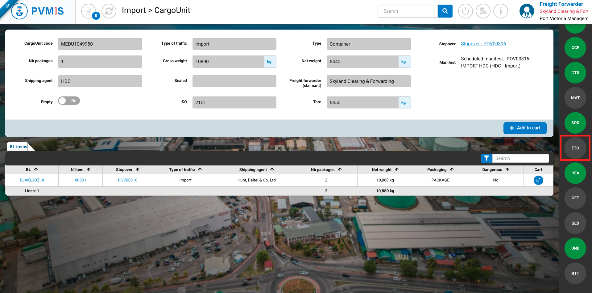 The Full containe release (IMPORT) transport related to the ETO (Exit Transport Order) is created for each Cargo Unit.