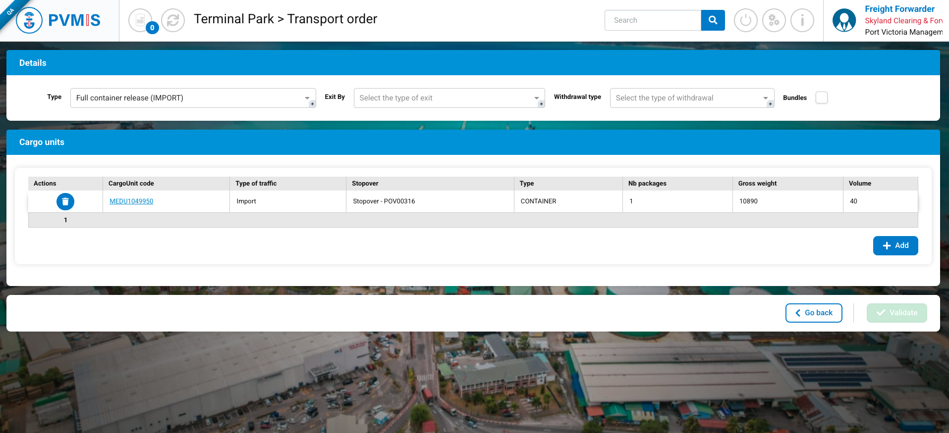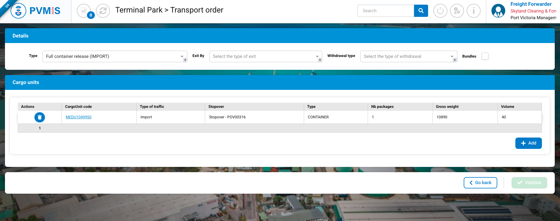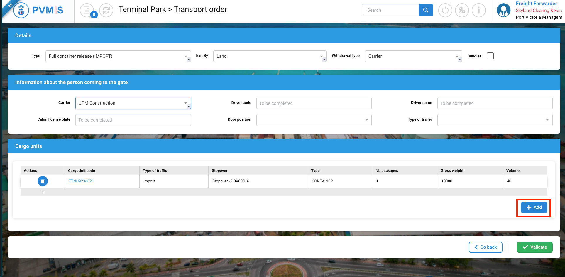 On the transport order creation form, the type of the transport order is prefiled and the cargo unit is selected (Cargo Units section), but you can add more by clicking on +Add button.