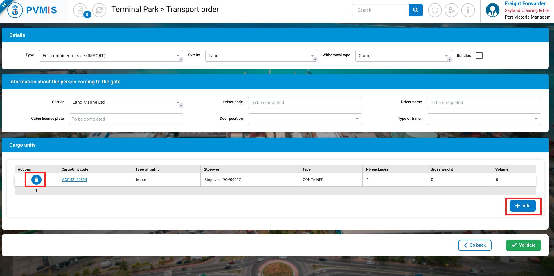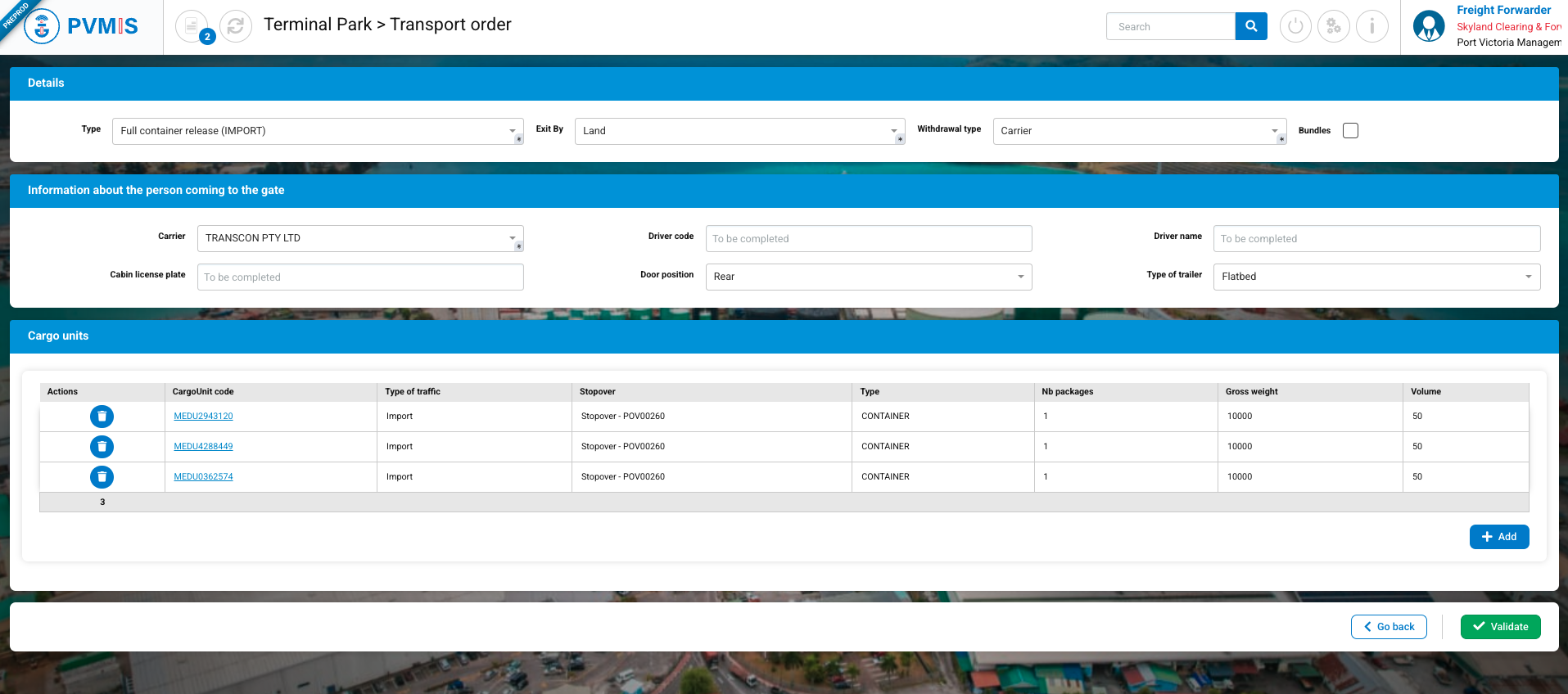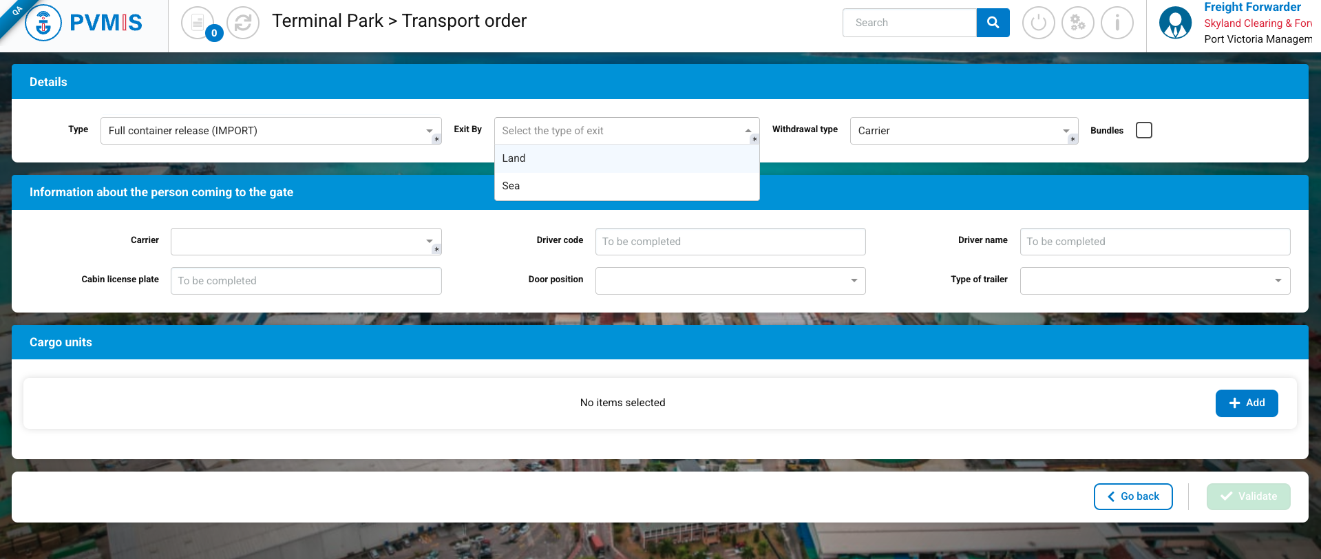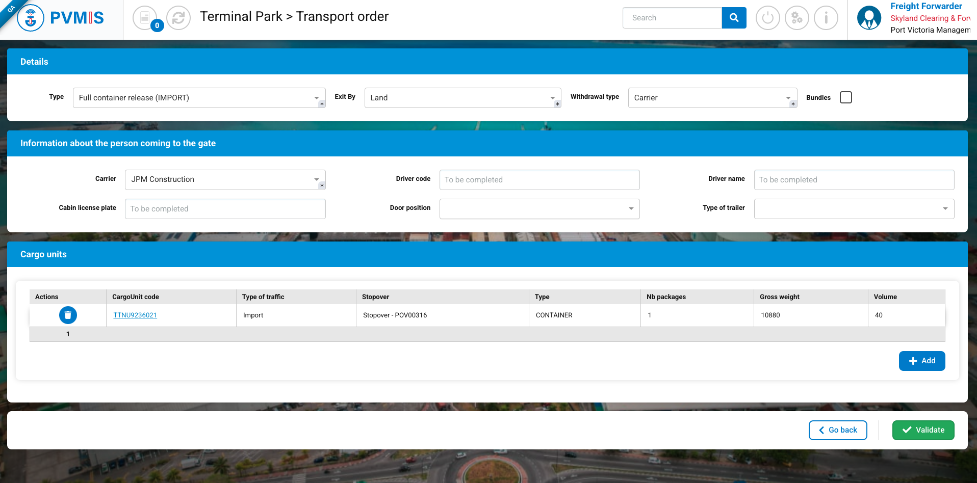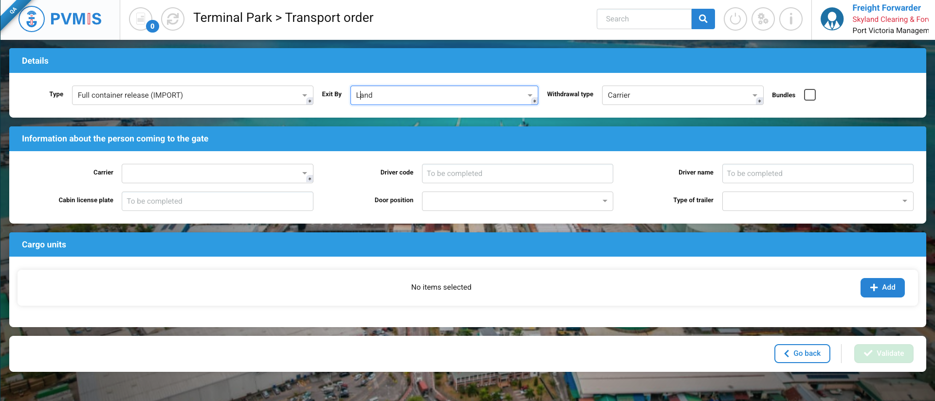 As a Claimant, to validate the transport order creation form, it is mandatory to complete all the fields in the Details section, enter a transport company in the Carrier field in the Information about the person coming to the gate section, and add at least one Cargo Unit.