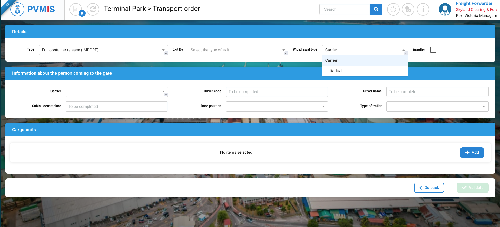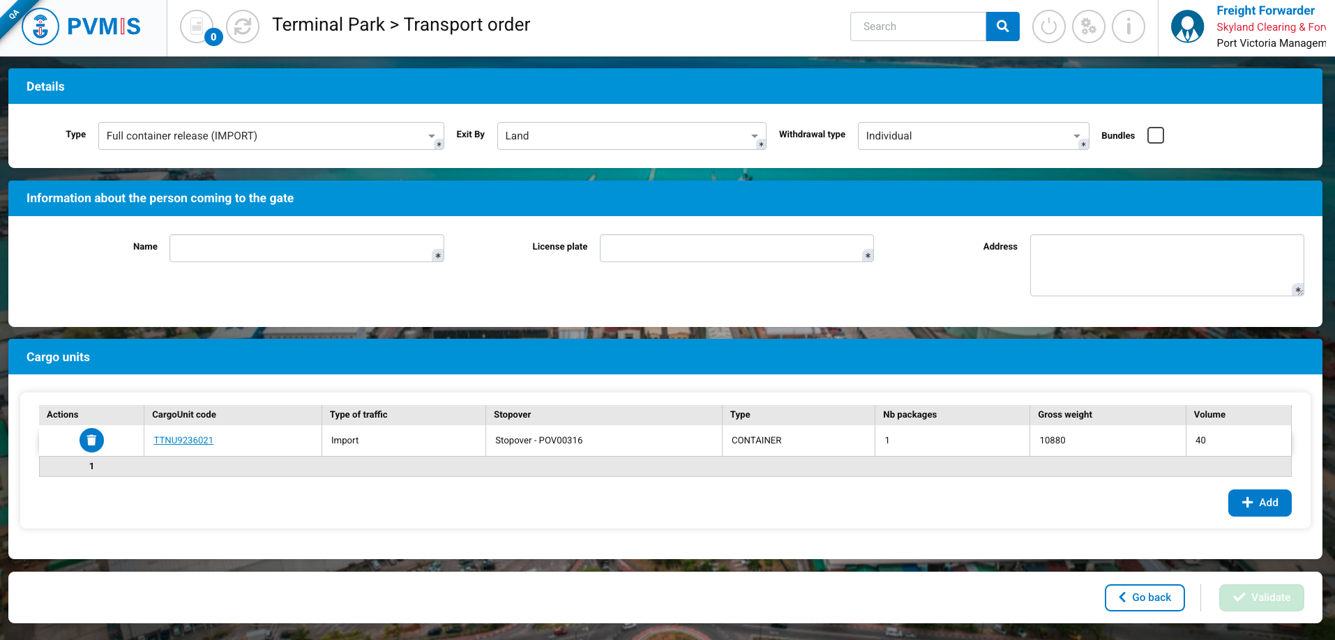 To validate the creation form, if the user selects this type of withdrawal, it is mandatory to complete all the fields in the Details section, all the fields in the Information about the person coming to the gate section (Name, License plate, and Address), and add at least one Cargo Unit.
