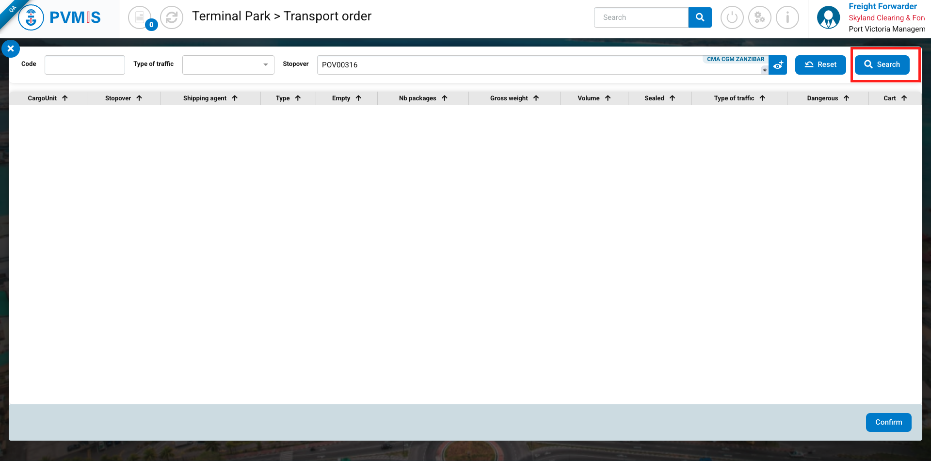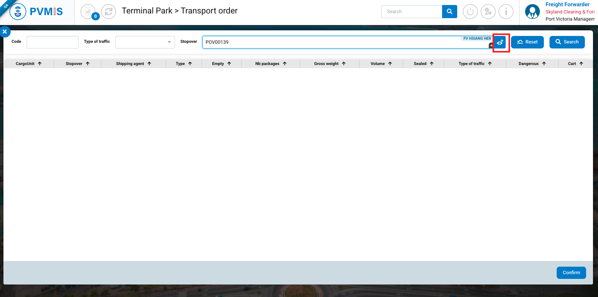To select cargo unit, make a research relating to the stopover entering the stopover code (POVXXXXX) or click on eye icon to display the list of the stopover.