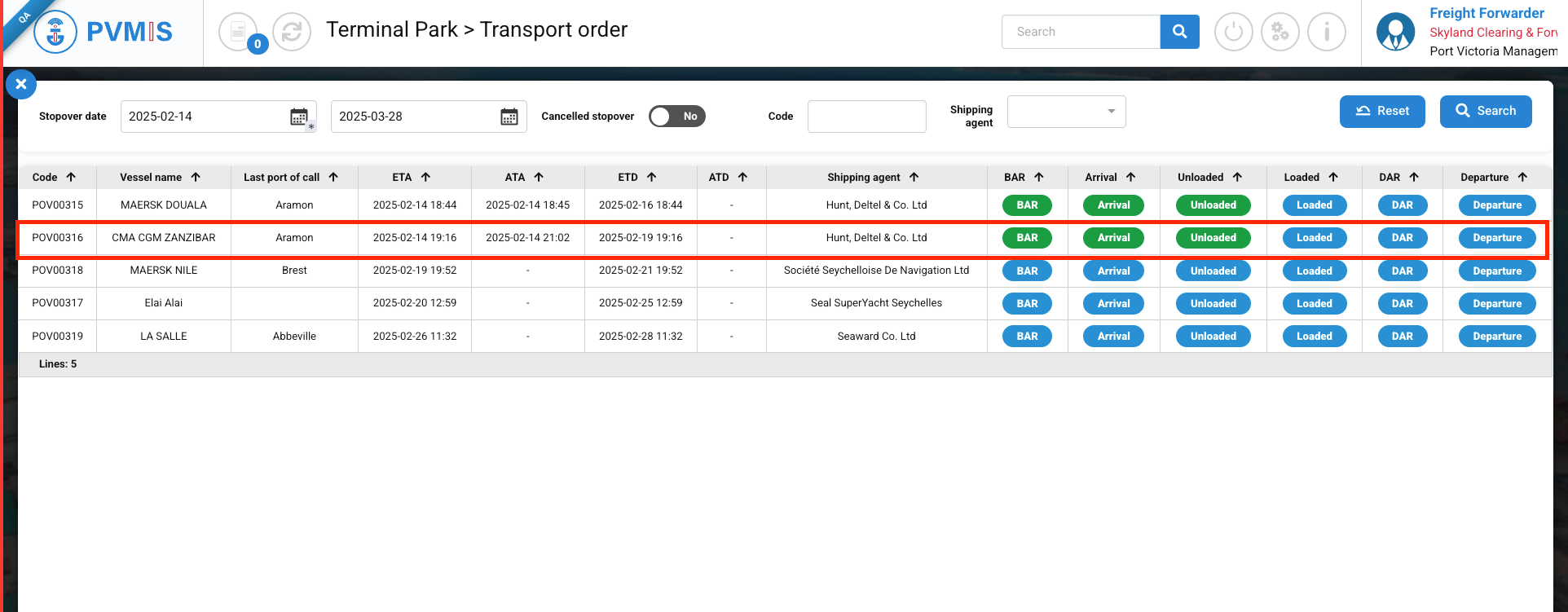 By clicking on the icon to search for a stopover, the list of stopovers will be displayed. Click on the line of the stopover to which the Cargo Units you wish to add to your transport order are associated.