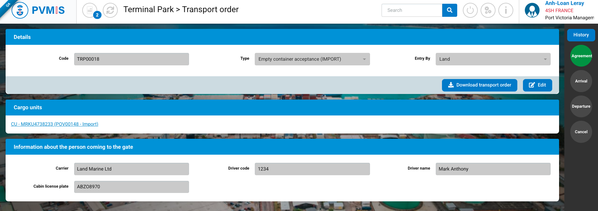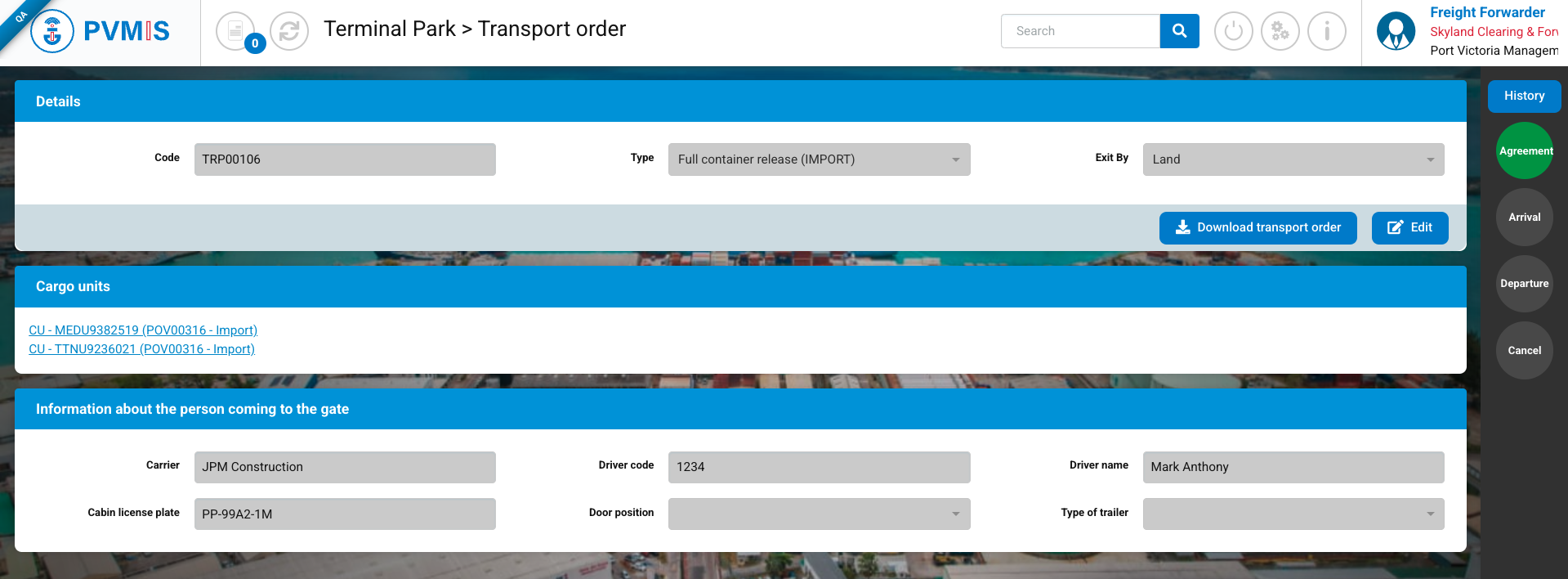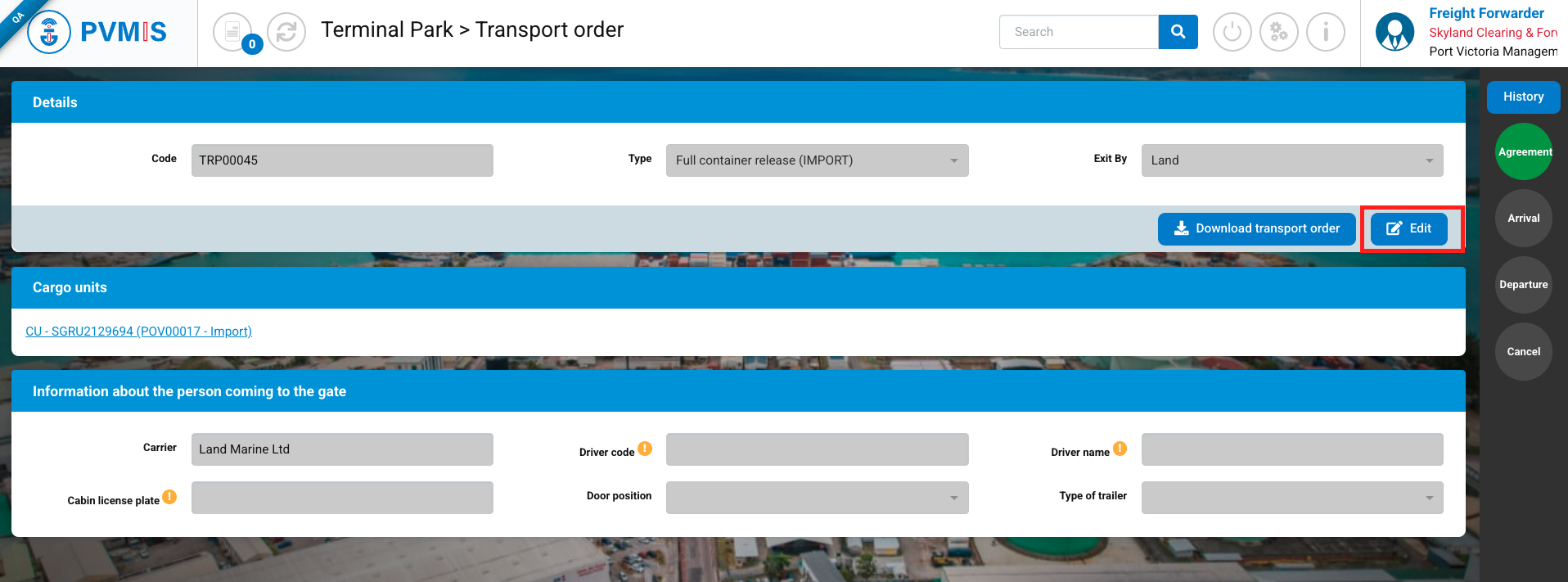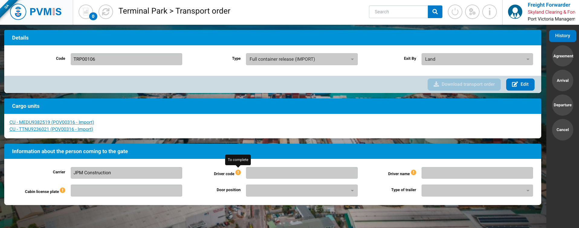 If the Driver code, Driver name, and Cabin license plate information has been completed by the claimant or the carrier, and a gate operator has declared the transporter's arrival (Arrival status in YES or PARTIAL state on the transport order), then neither role will be able to modify these details.