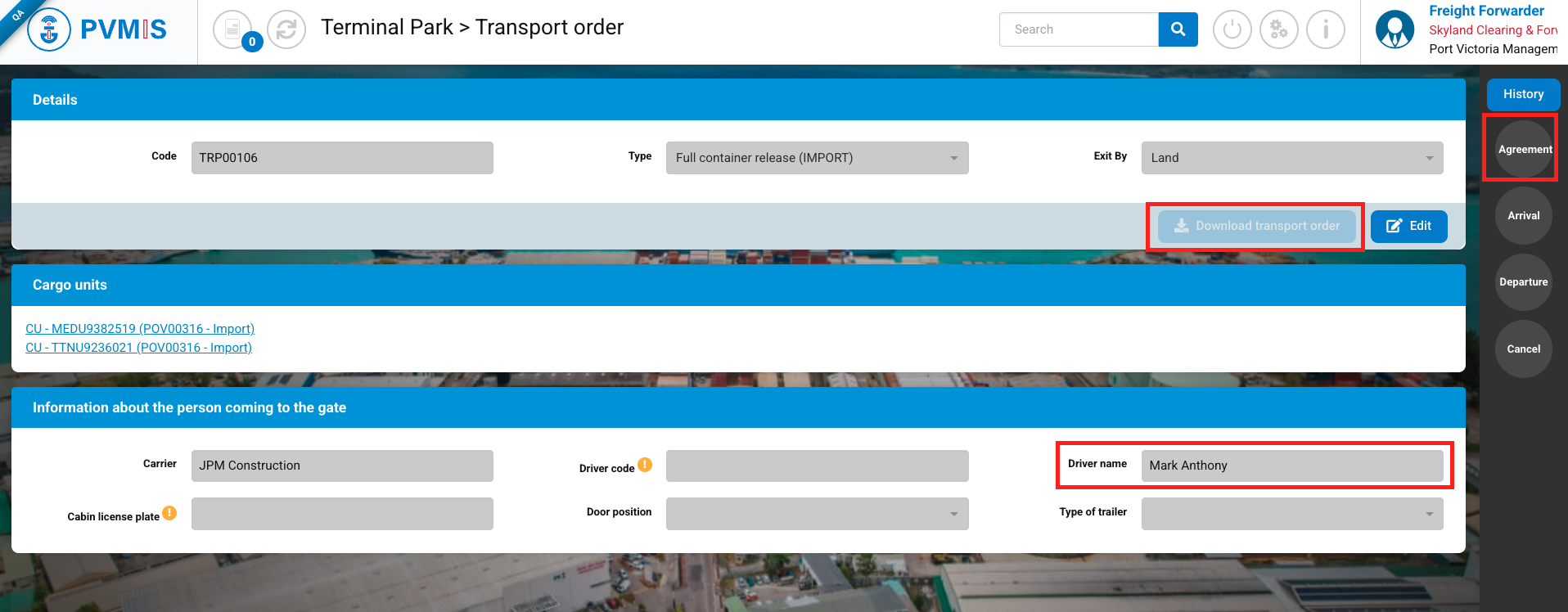 However, if you complete all three fields and all the Cargo Units included in this same transport order are authorized to exit the terminal (ULA + CCF + GTR + HEA + ETO), then the Agreement status will change to YES, and you will be able to download the mission order in PDF.