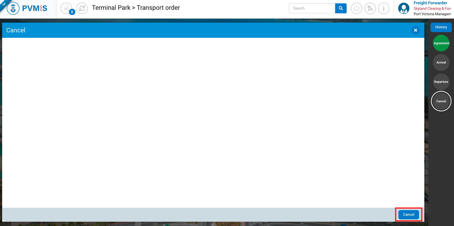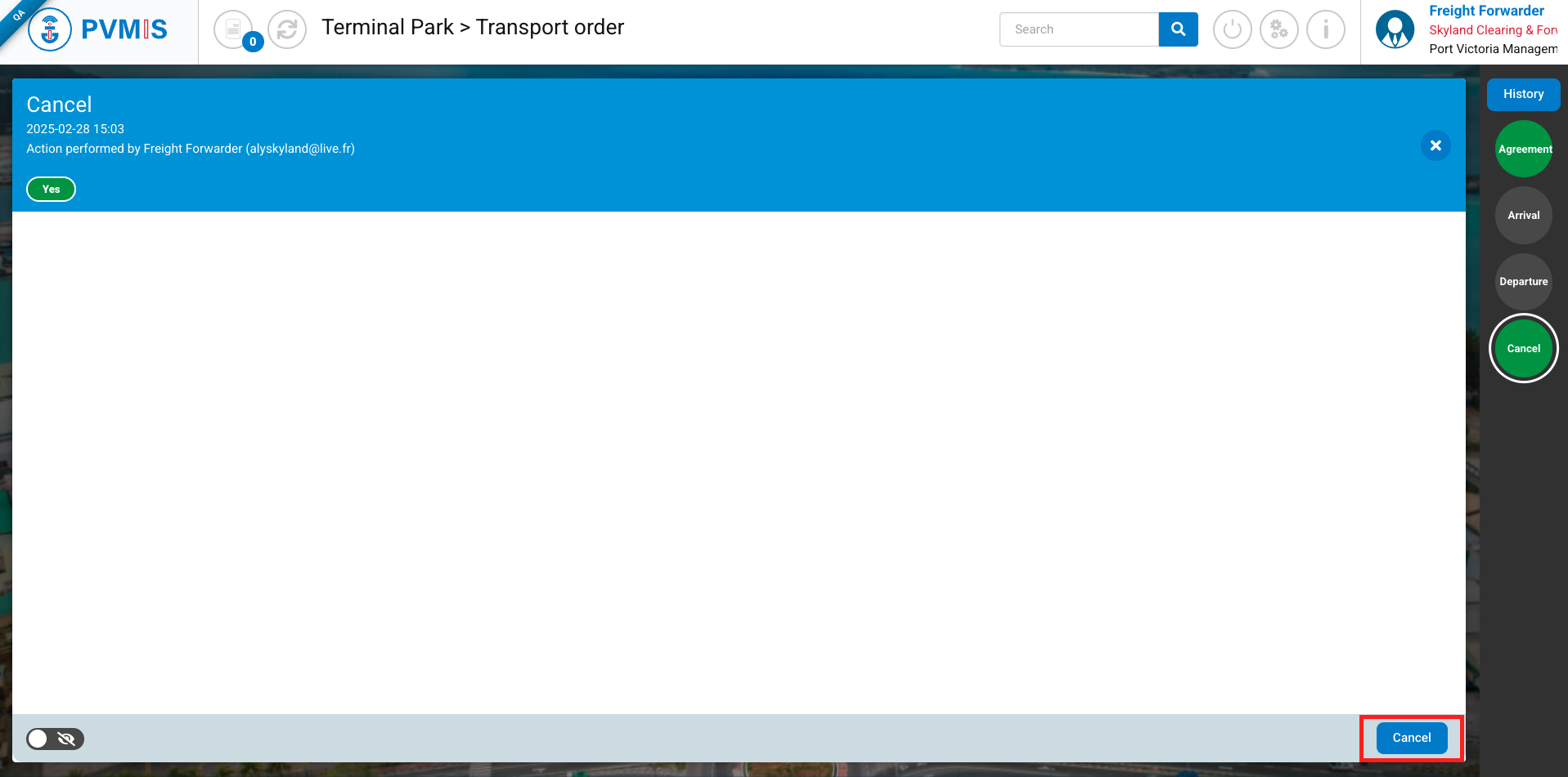 Once the transport order is cancelled, as a gate operator, it will not be possible to declare the transporter's arrival.