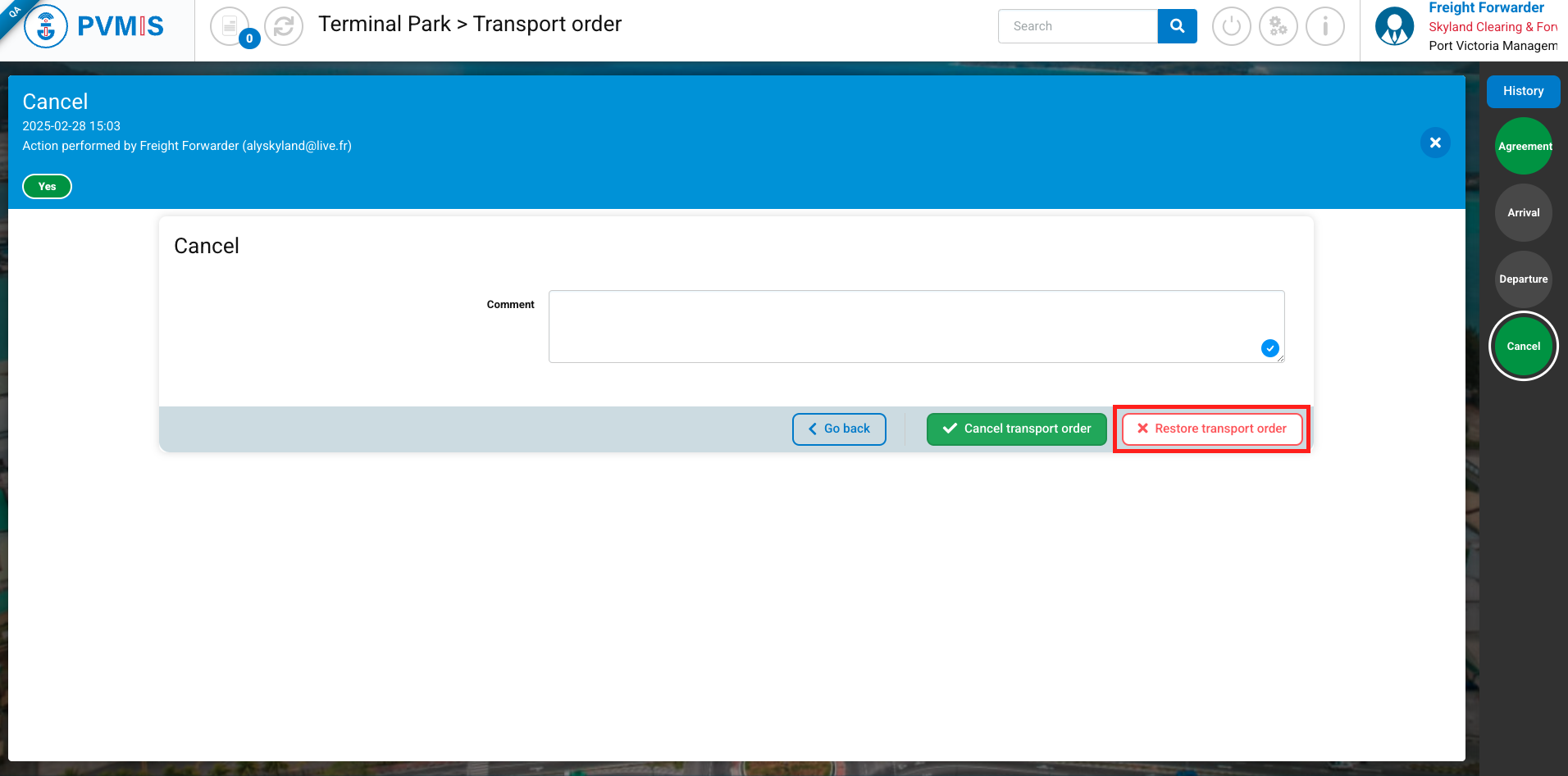 If the claimant wishes to restore their transport order, they must click again on the Cancel status in the YES state, then click on the Cancel button to access the associated form.