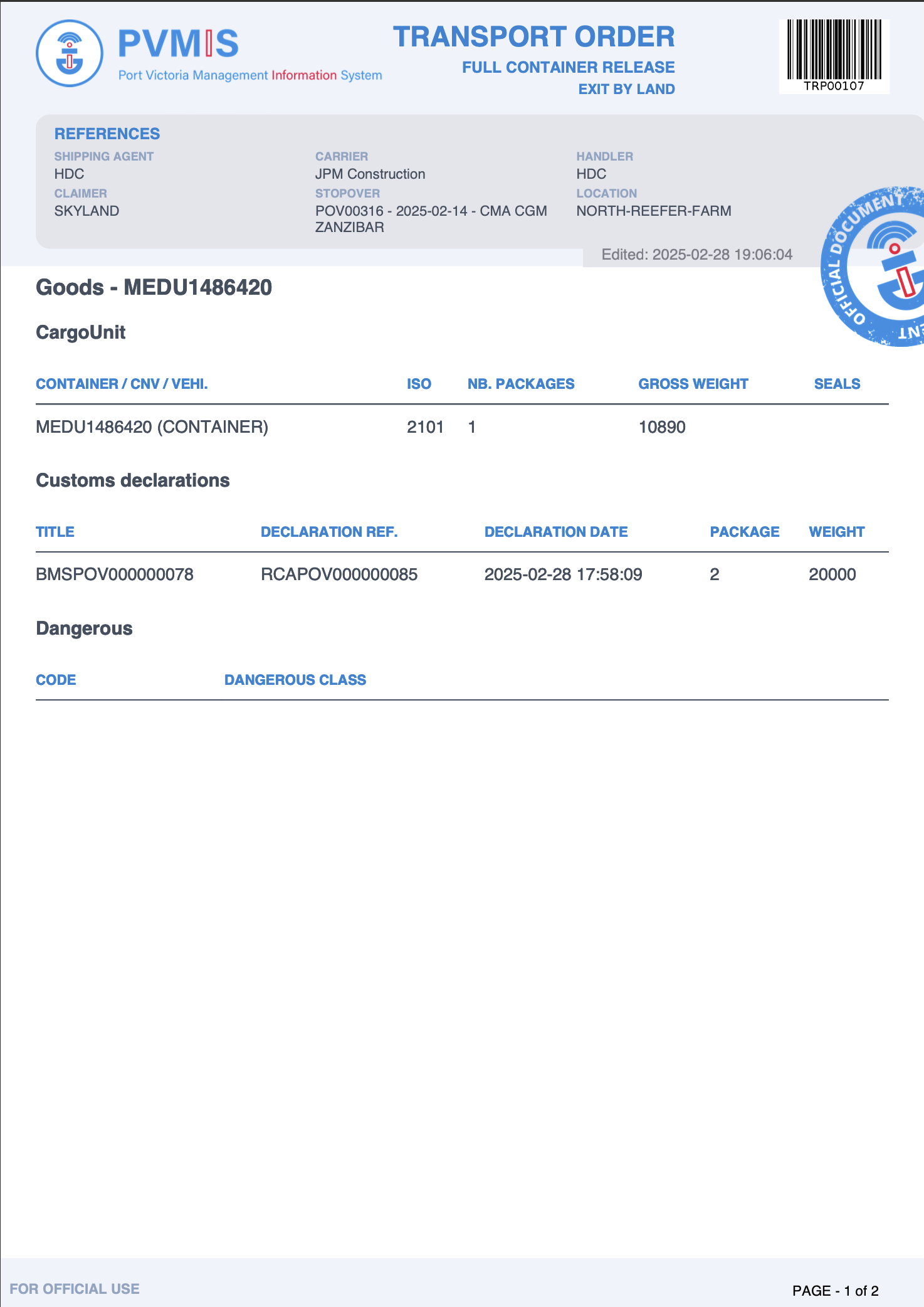 The mission order PDF is a unique document. In the case of managing partial exits or entries of Cargo Units, the document presented at the gate must be the same for each round trip of Cargo Unit exit or empty container entry.