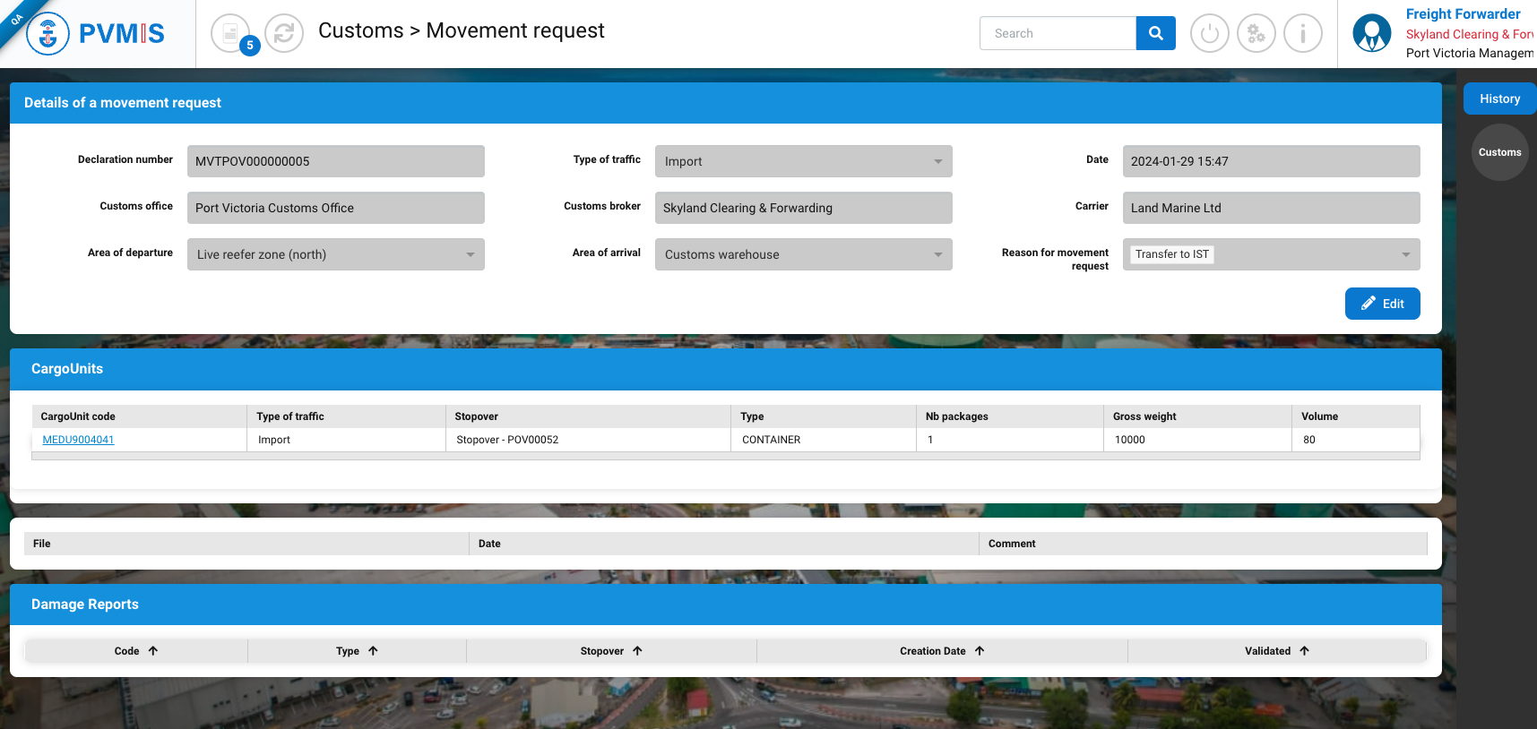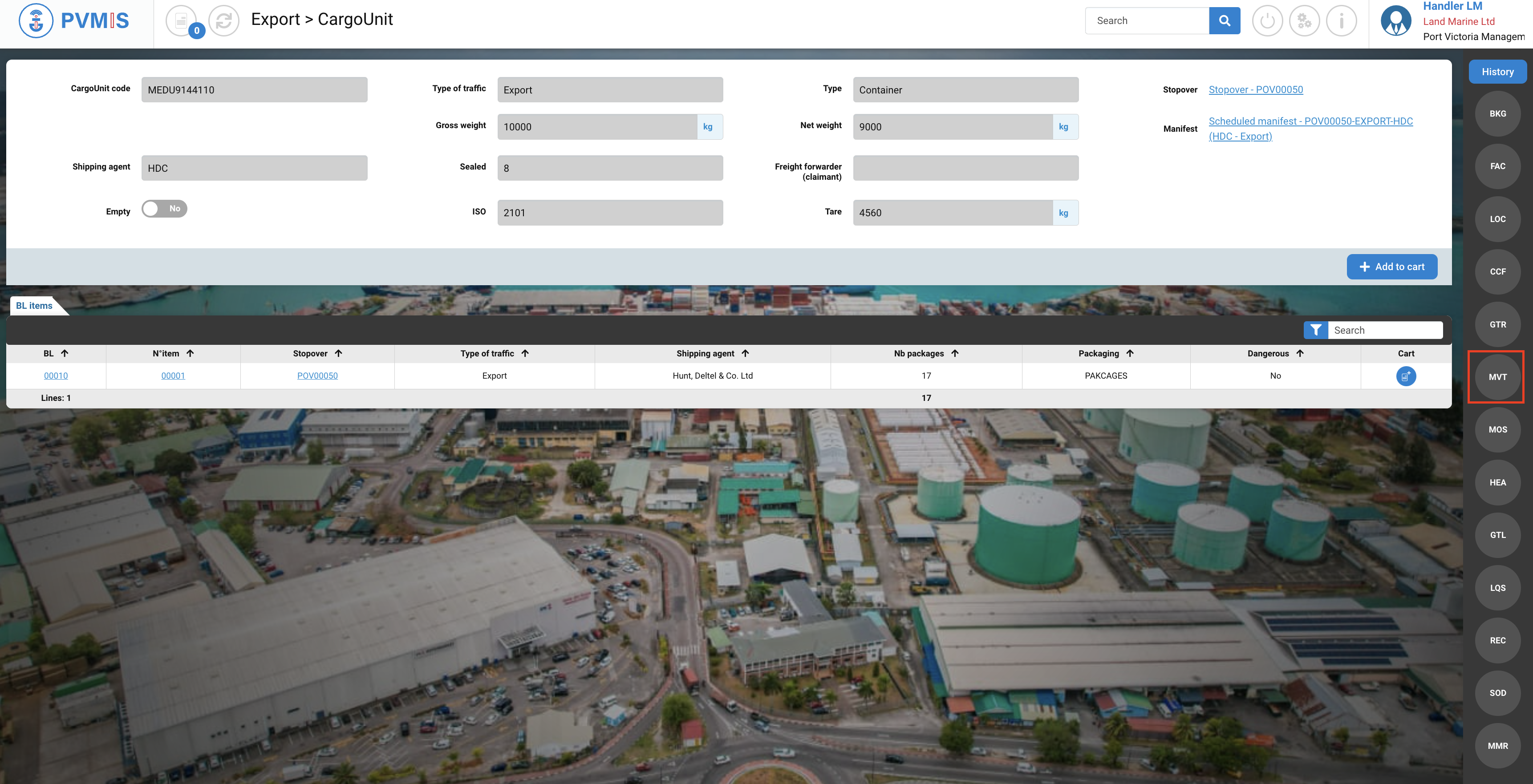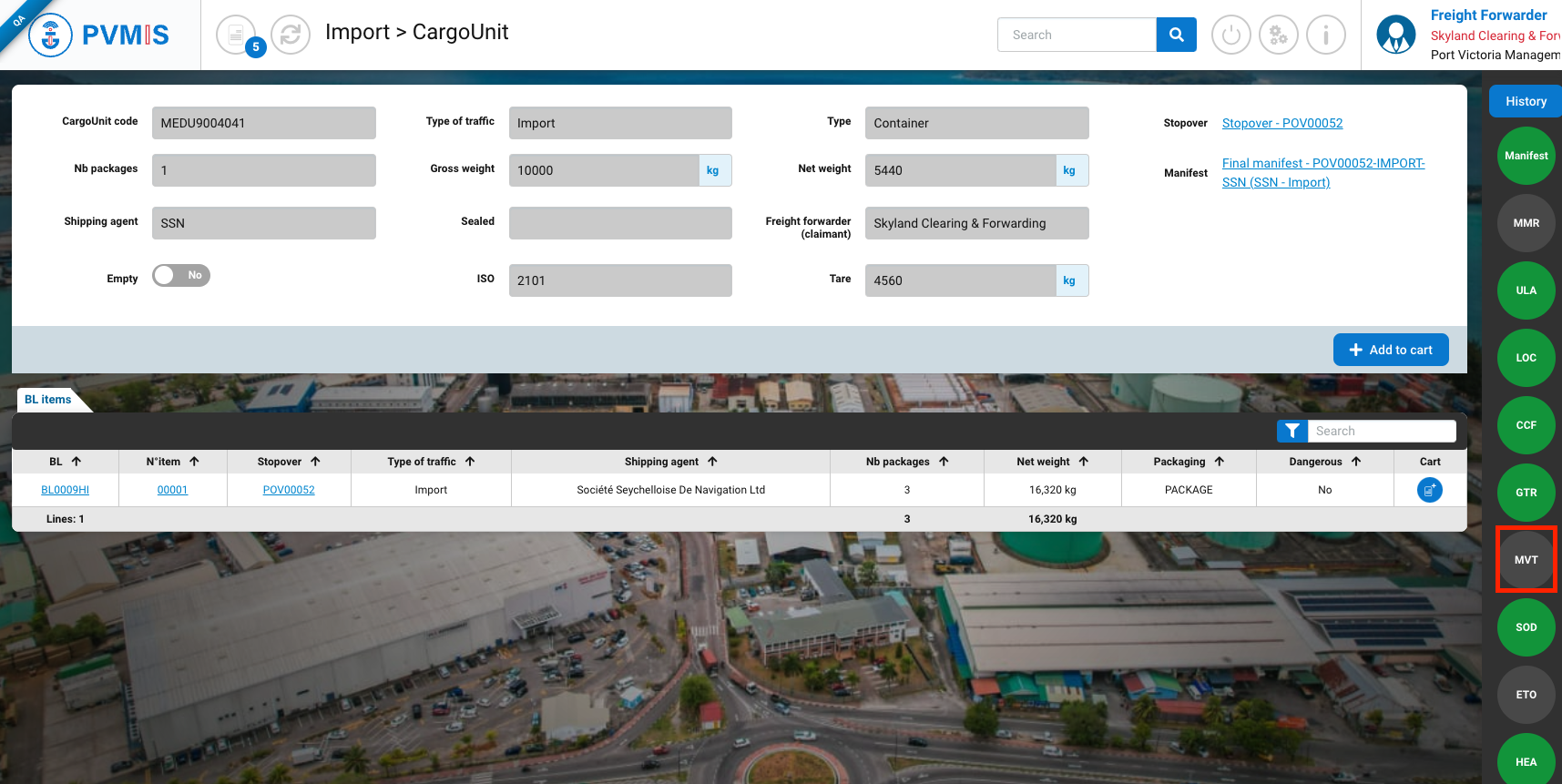 You will be redirected on the detail page of the CargoUnit and click on MVT indicator on the righ of the screen:
