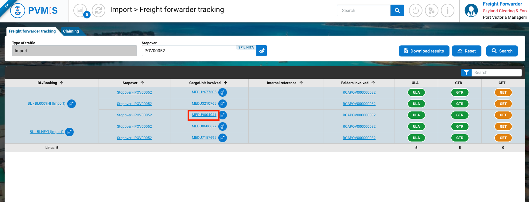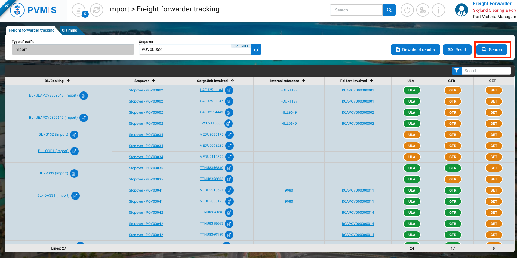 The list or CargoUnit located in the terminal and assigned to the freight forwarder company is presented, you can filter by stopover. After entering the stopover, click on Search button: