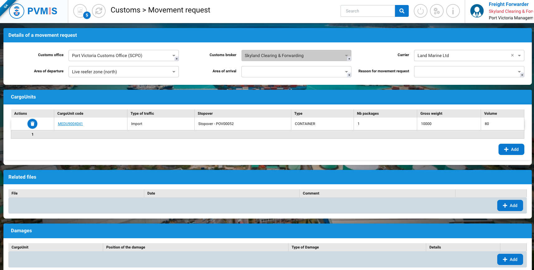 As a freigh forwarder, to move a CargoUnit, go to the detail of CargoUnit, click on Freight forwarder tracking menu in the Import or Export section :
