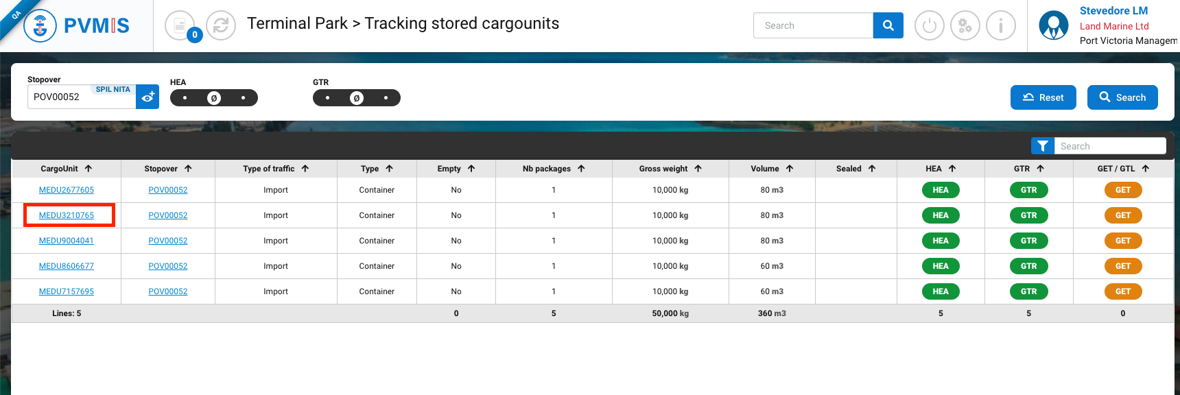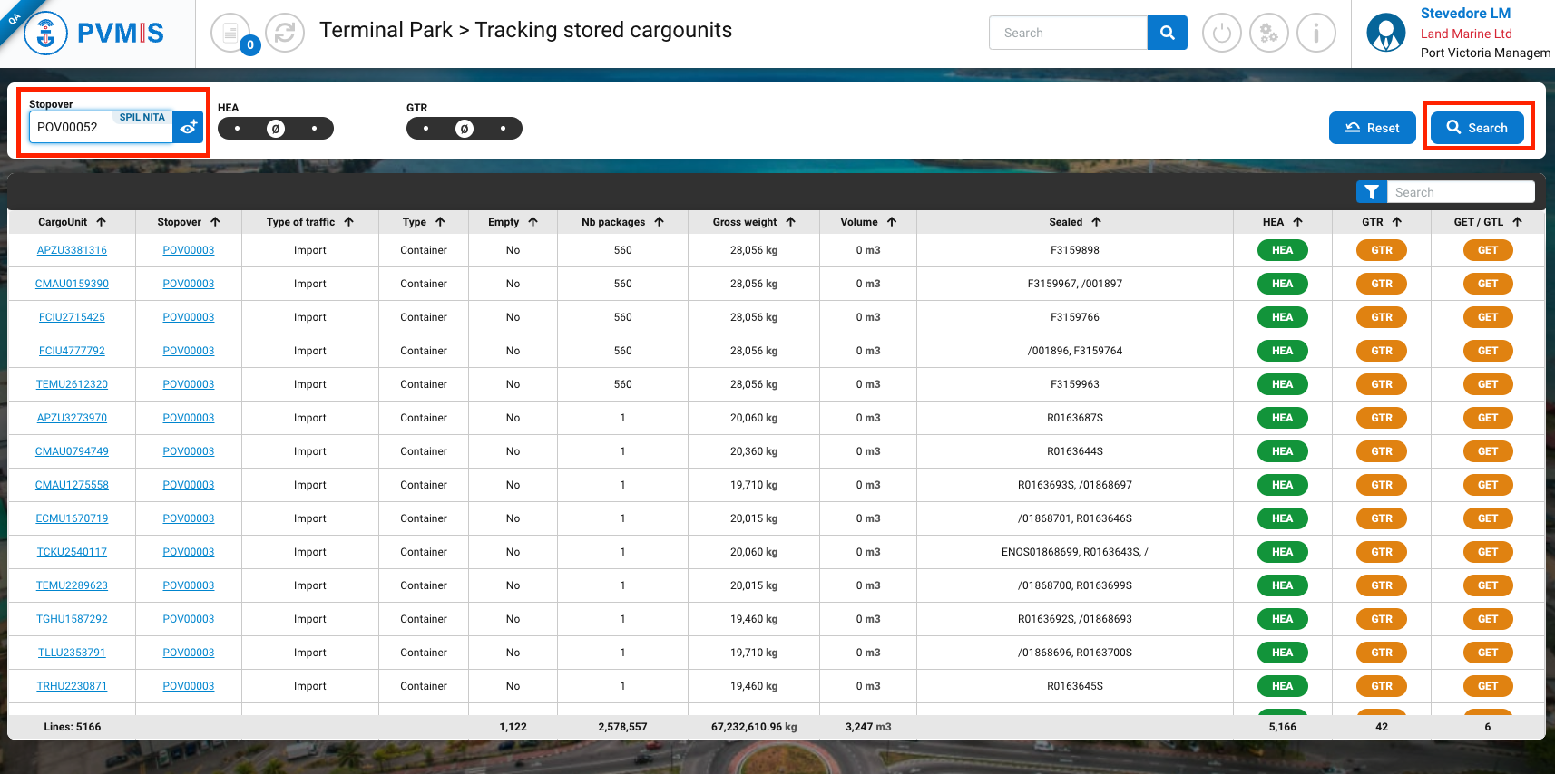 The list of CargoUnit located in the terminal is presented, you can refill quickly by filtering CargoUnits by stopover. After entering the Stopover code, click on Search button: