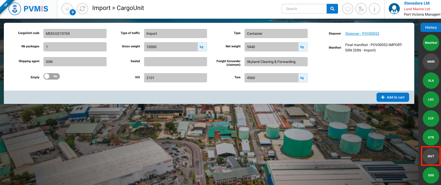 On the detail page of a CargoUnit, you can consult the information, then click on MVT status on the right of the screen: