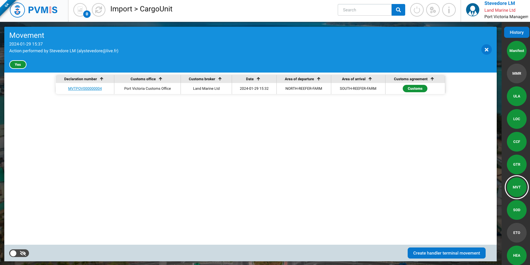 You will be redirected on the detail page of the CargoUnit and you can create an internal movement request by clicking on MVT indicator on the right of the screen: