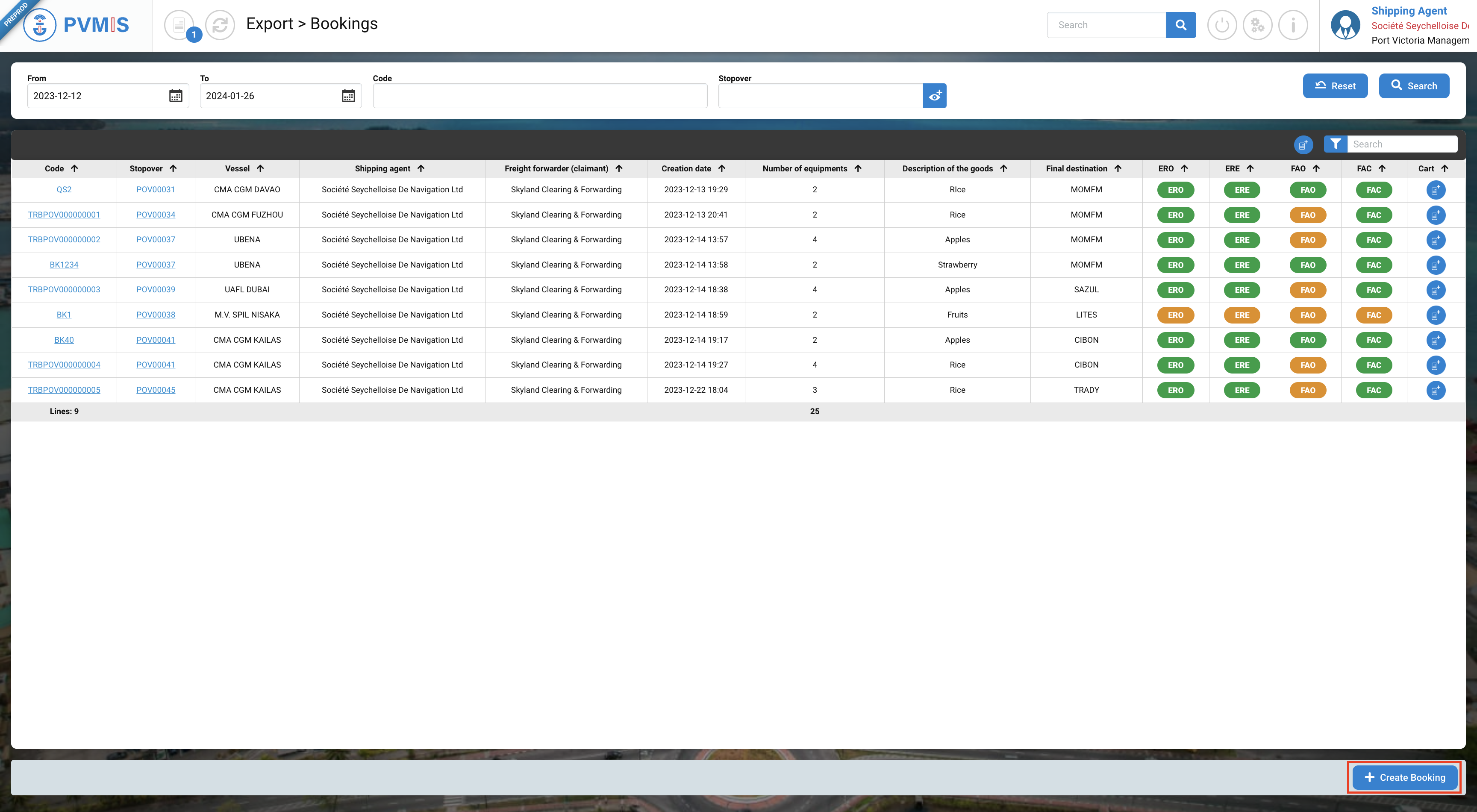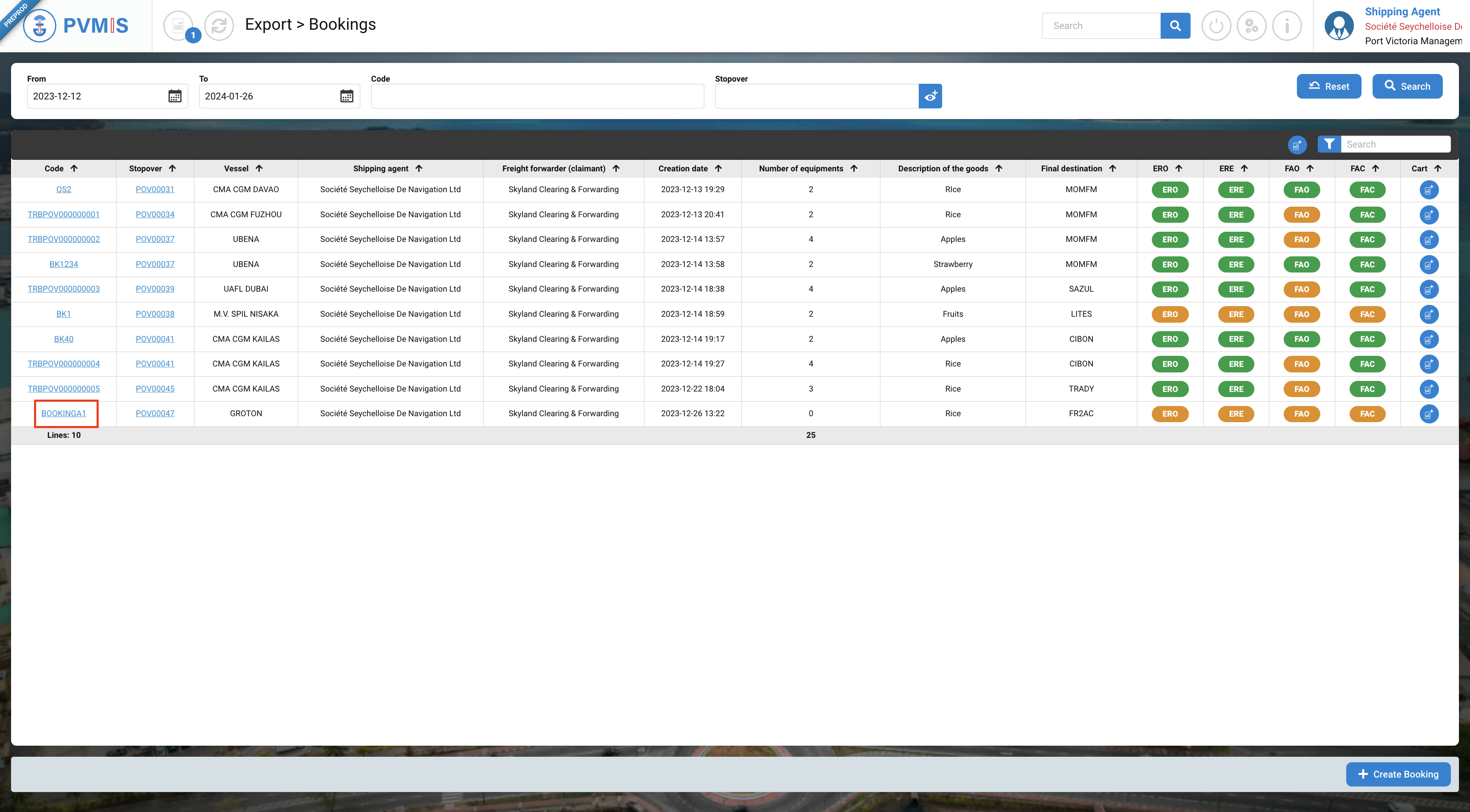 A list of all bookings falling within the specified date range is presented. Click on +Create Booking button: