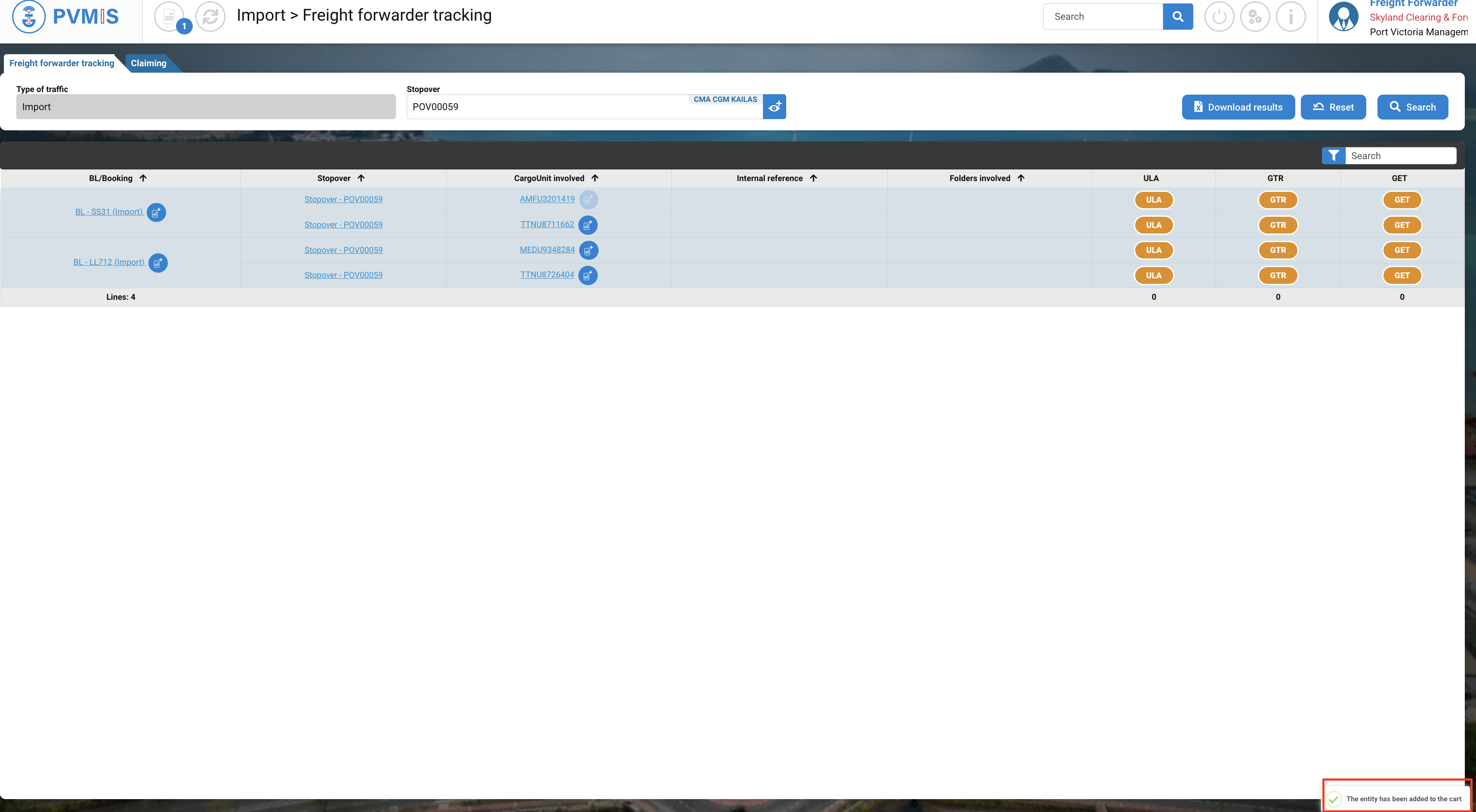 After clicking on Cart icon, at the right bottom a message will appear to confirm the selection of the entity: