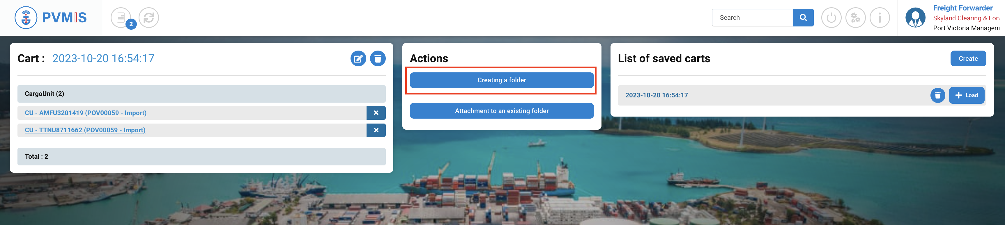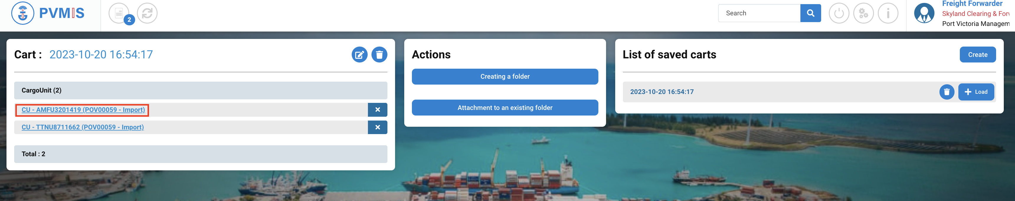 In the Cart, you can see in the left column the presence of the both CargoUnit entities, and on the Actions column click on Creating a folder button: