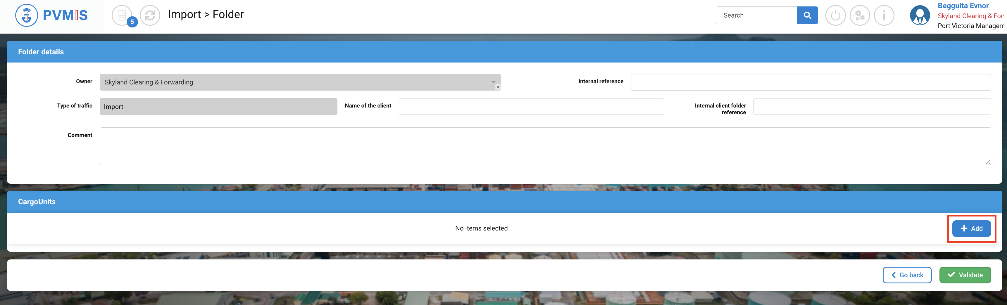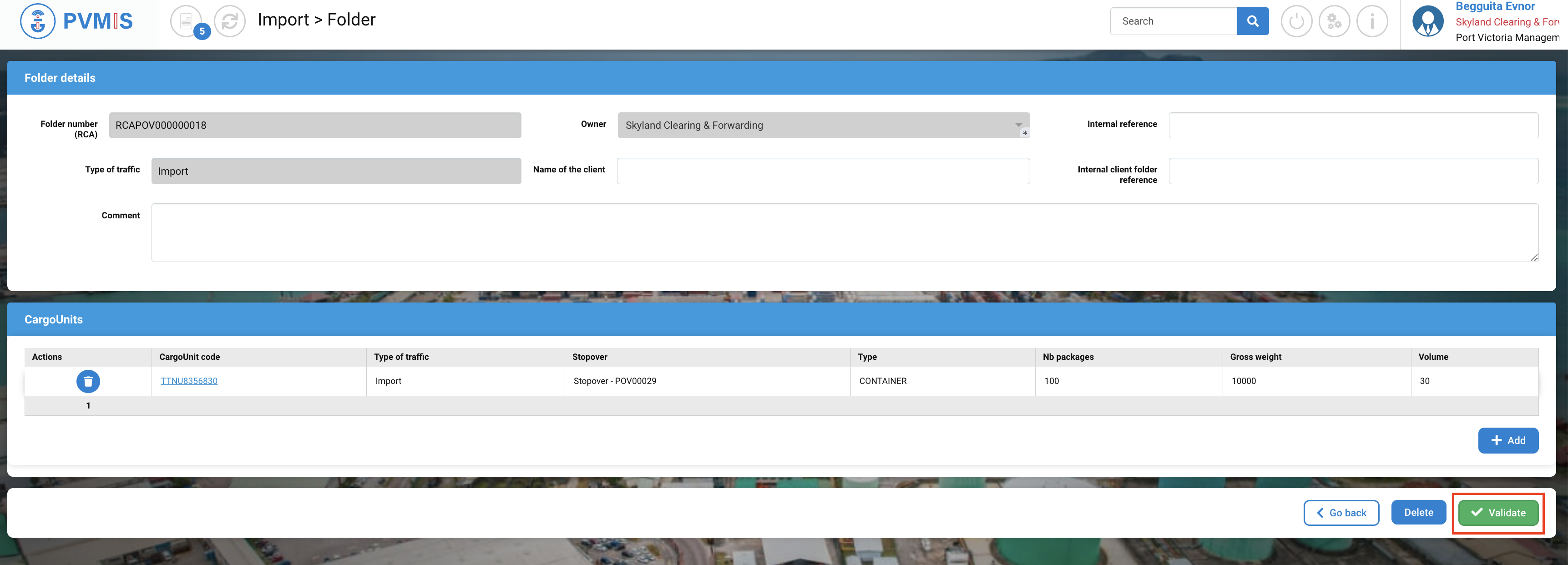 You can review the folder information, which is updated with the selection of CargoUnits. To create the folder, click on "Validated".