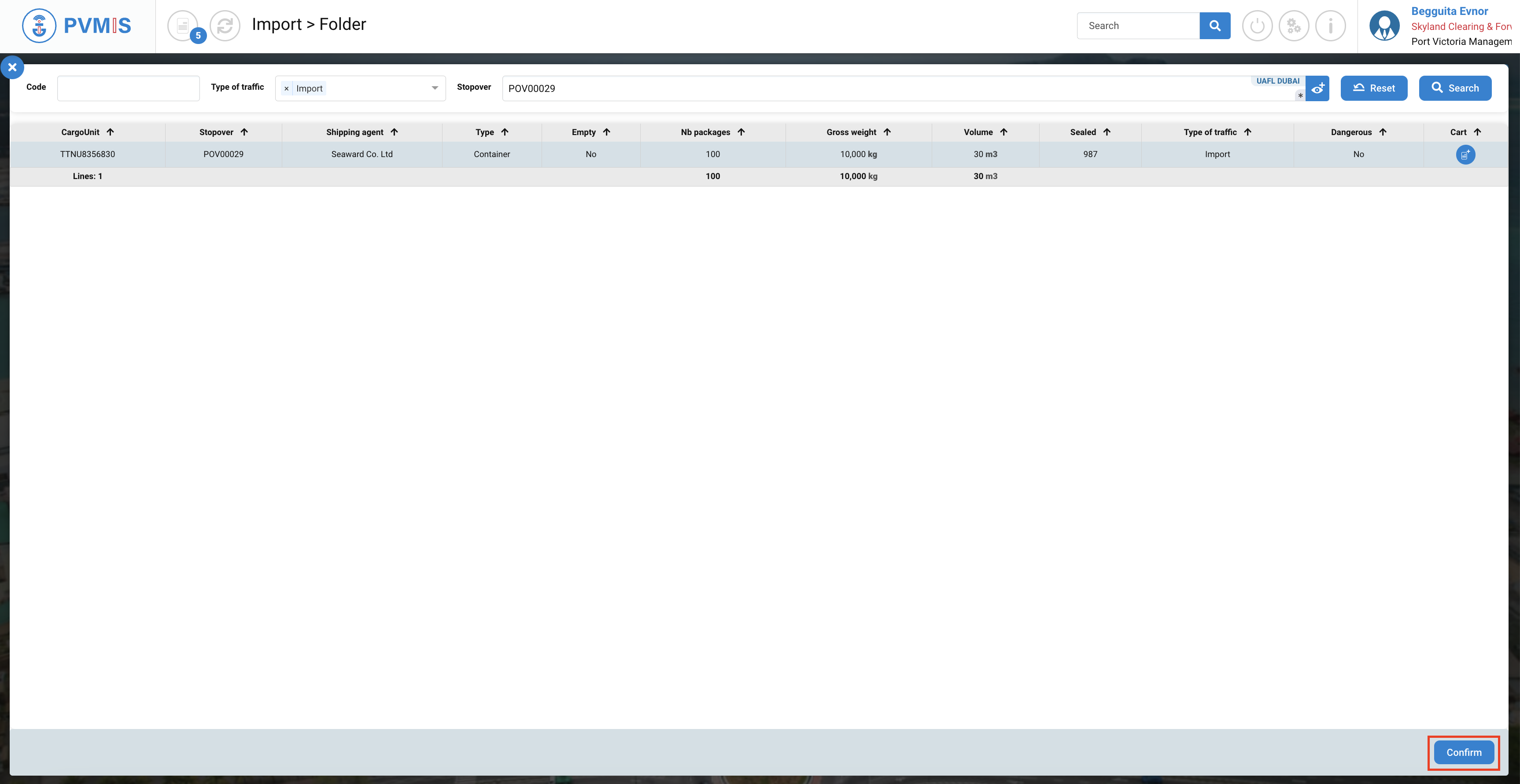 Select CargoUnit by clicking on the line and click on Confirm button: