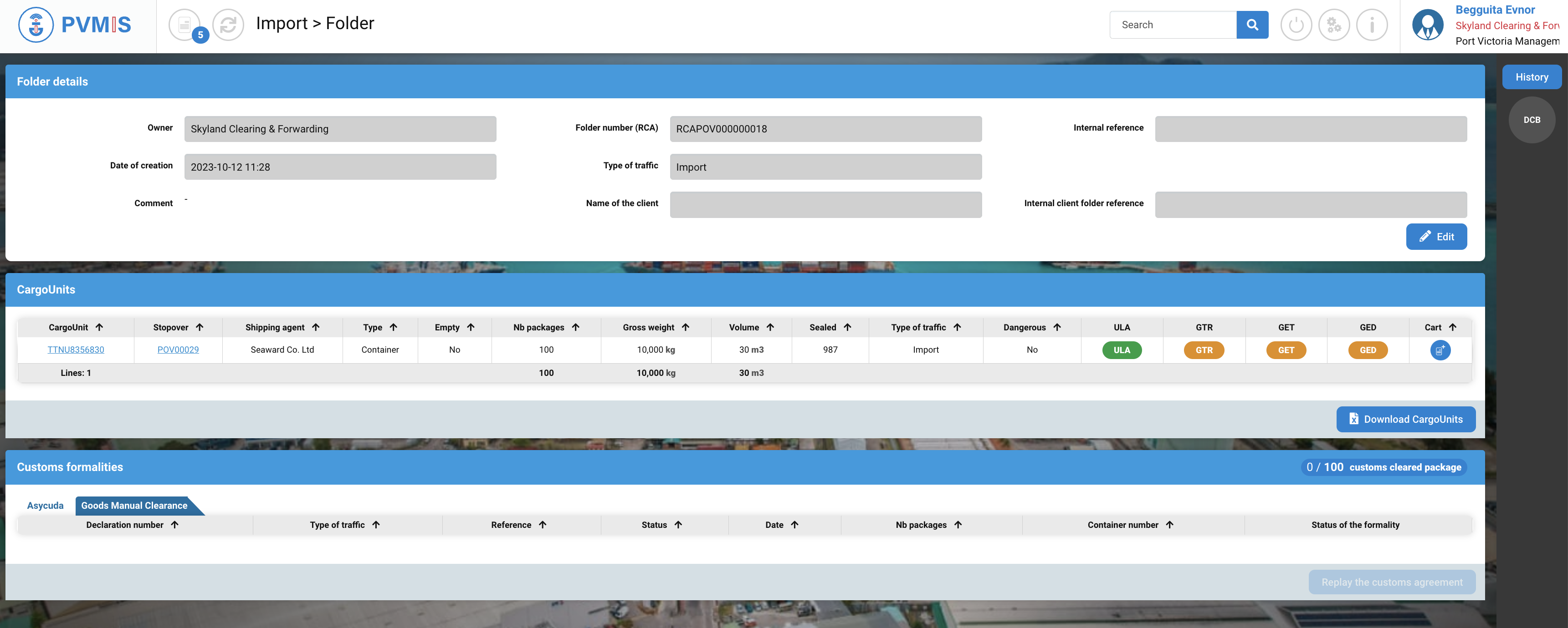 The customs clearance folder is now ready to receive formalities attesting of customs clearance.