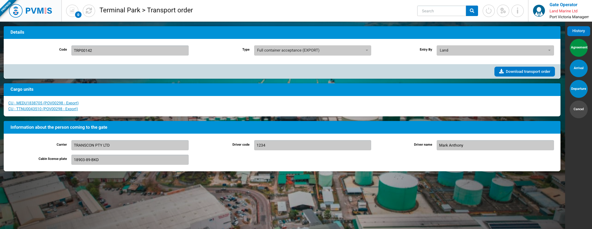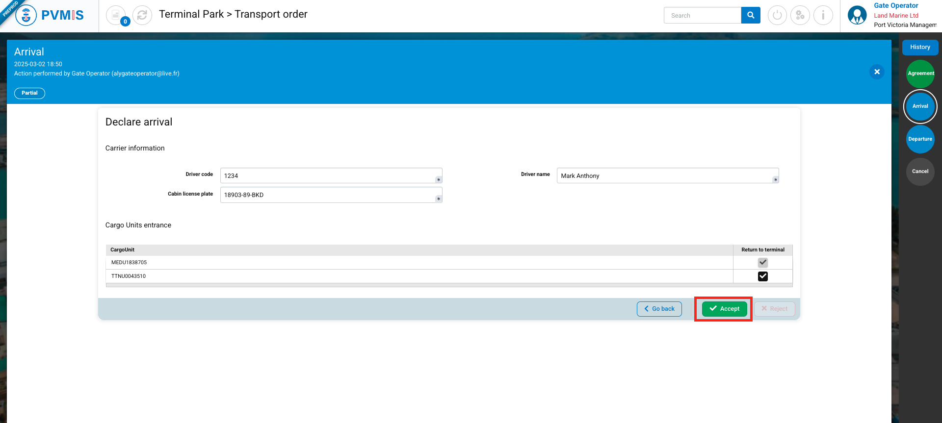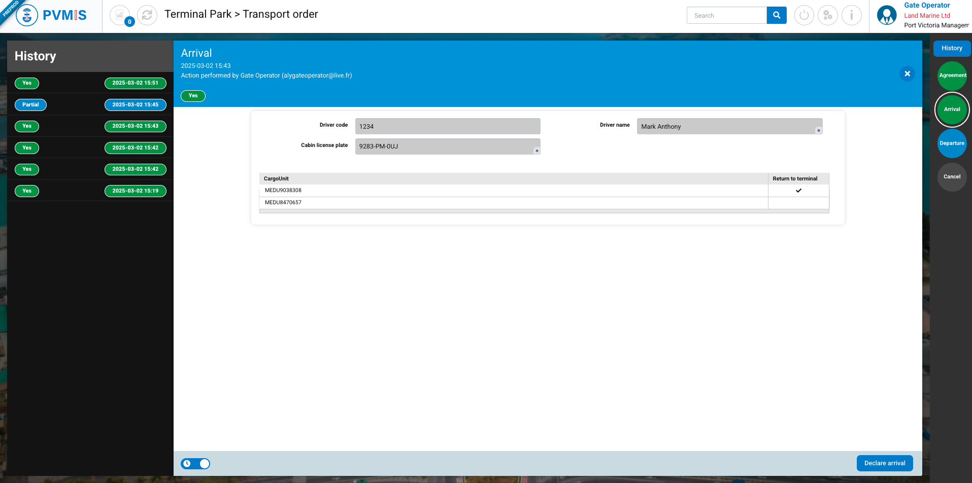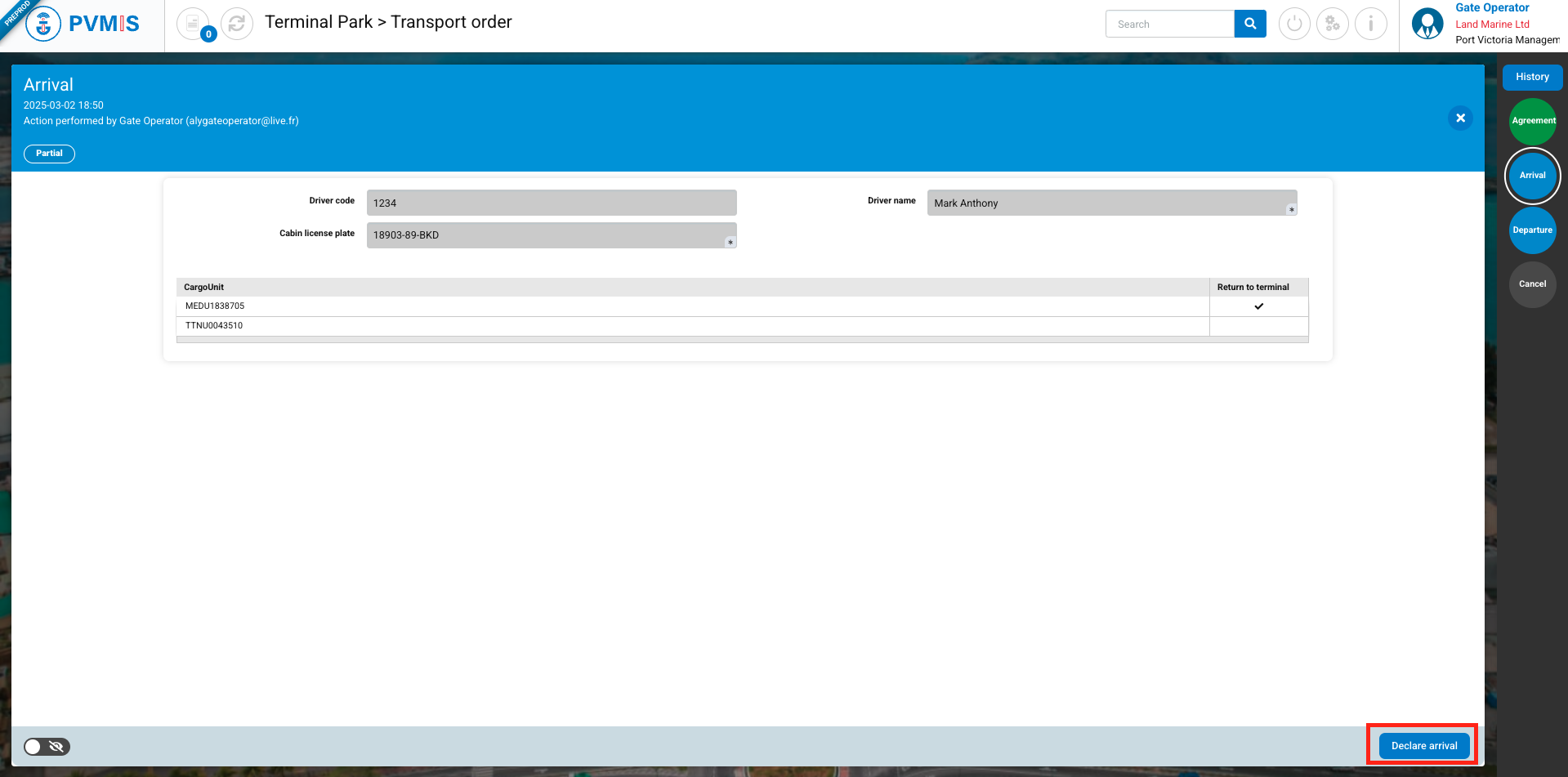 Therefore, as a Gate Operator, when the carrier must present themselves at the gate with the same transport order, you will need to declare the arrival.