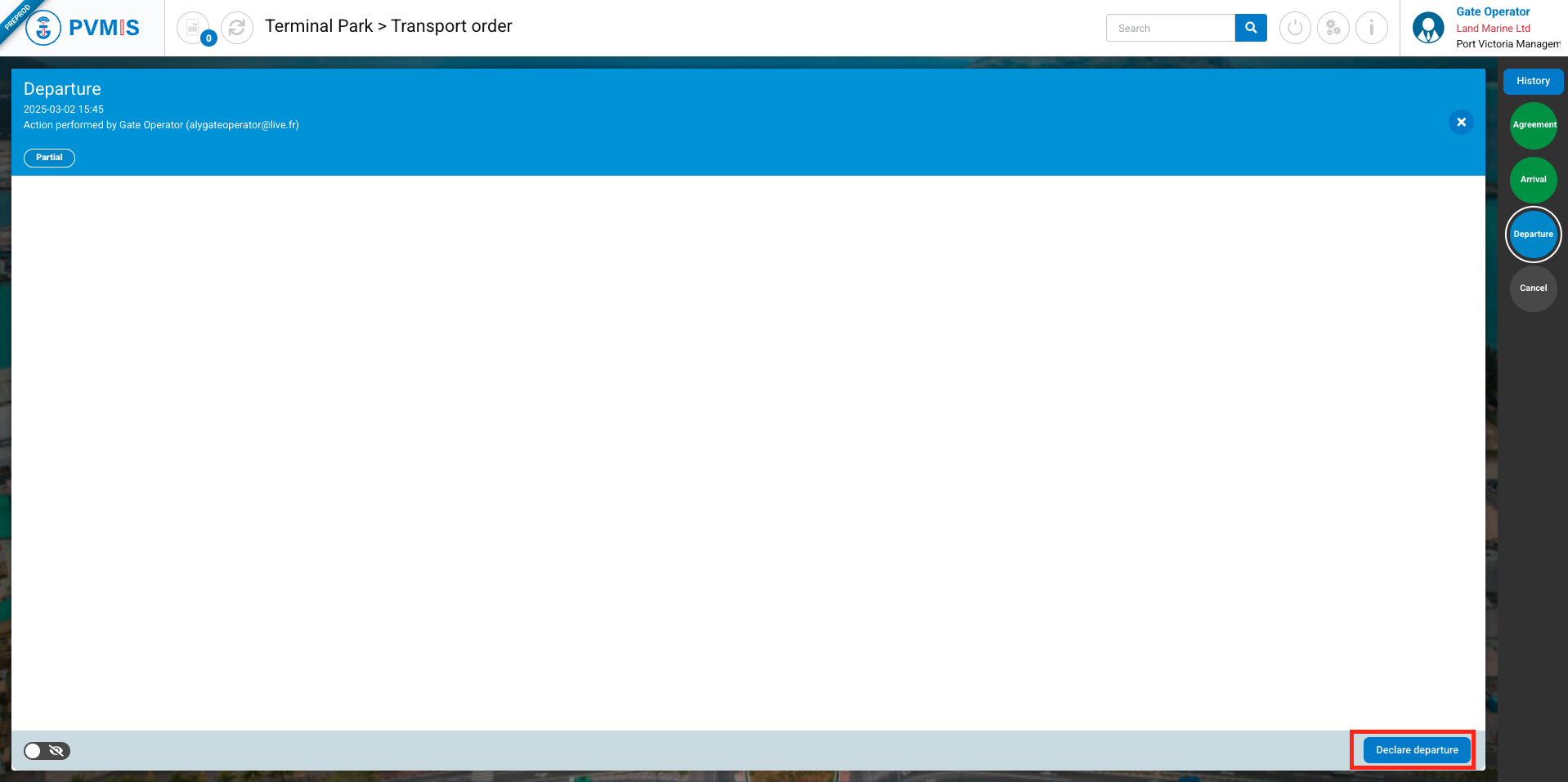 Similarly, if the departure declaration has not been made for a transport order, or if the Departure status is PARTIAL because there has already been a partial quantity of exits, and a transporter has already re-entered the terminal to retrieve the remaining quantity, the Declare Departure button will be displayed. When this button is clicked, the user will be taken directly to the departure declaration form.