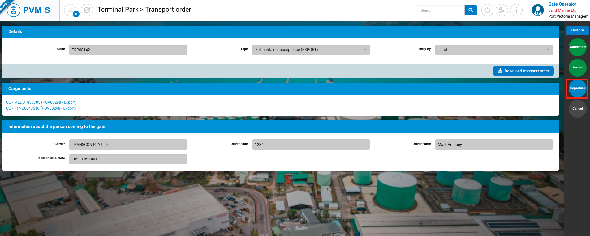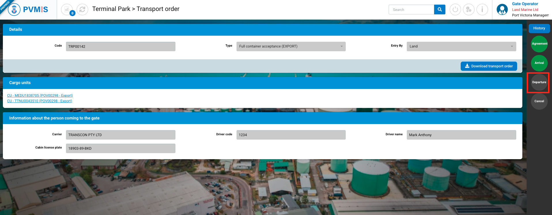 The user is redirected to the transport order detail screen. The Arrival and Departure statuses are in the 'PARTIAL' state, which means that the total number of full containers for the transport order has not entered the terminal, and the carrier will return to deposit the remaining containers.