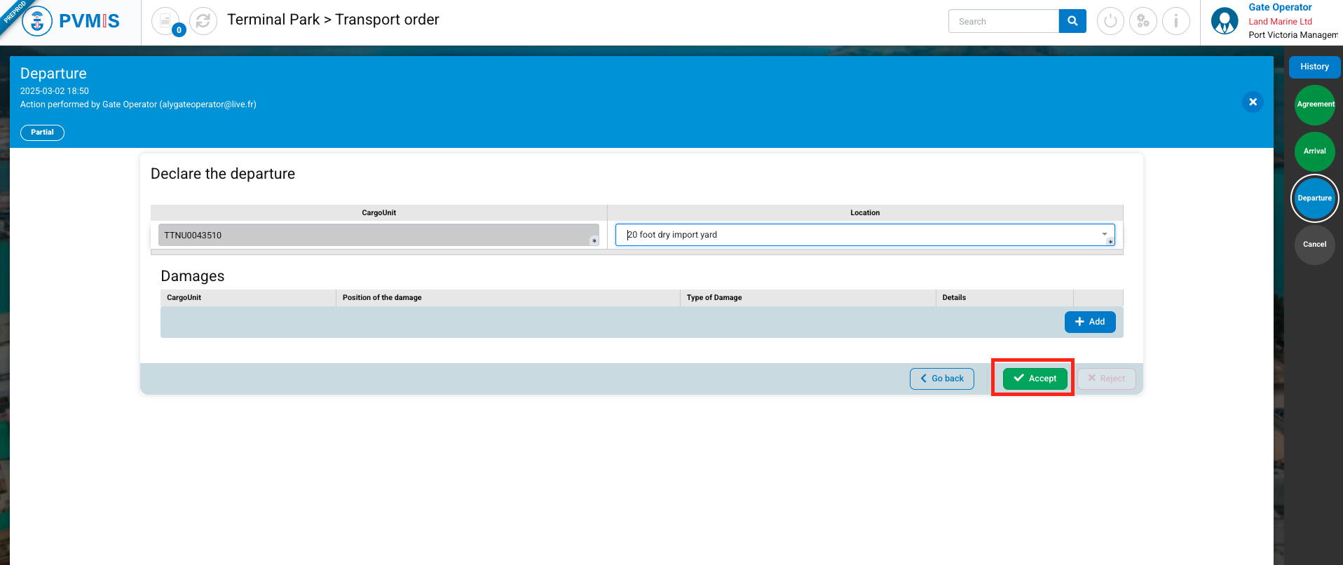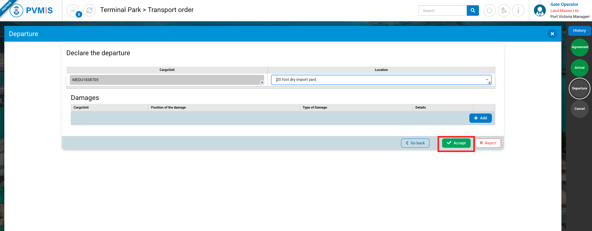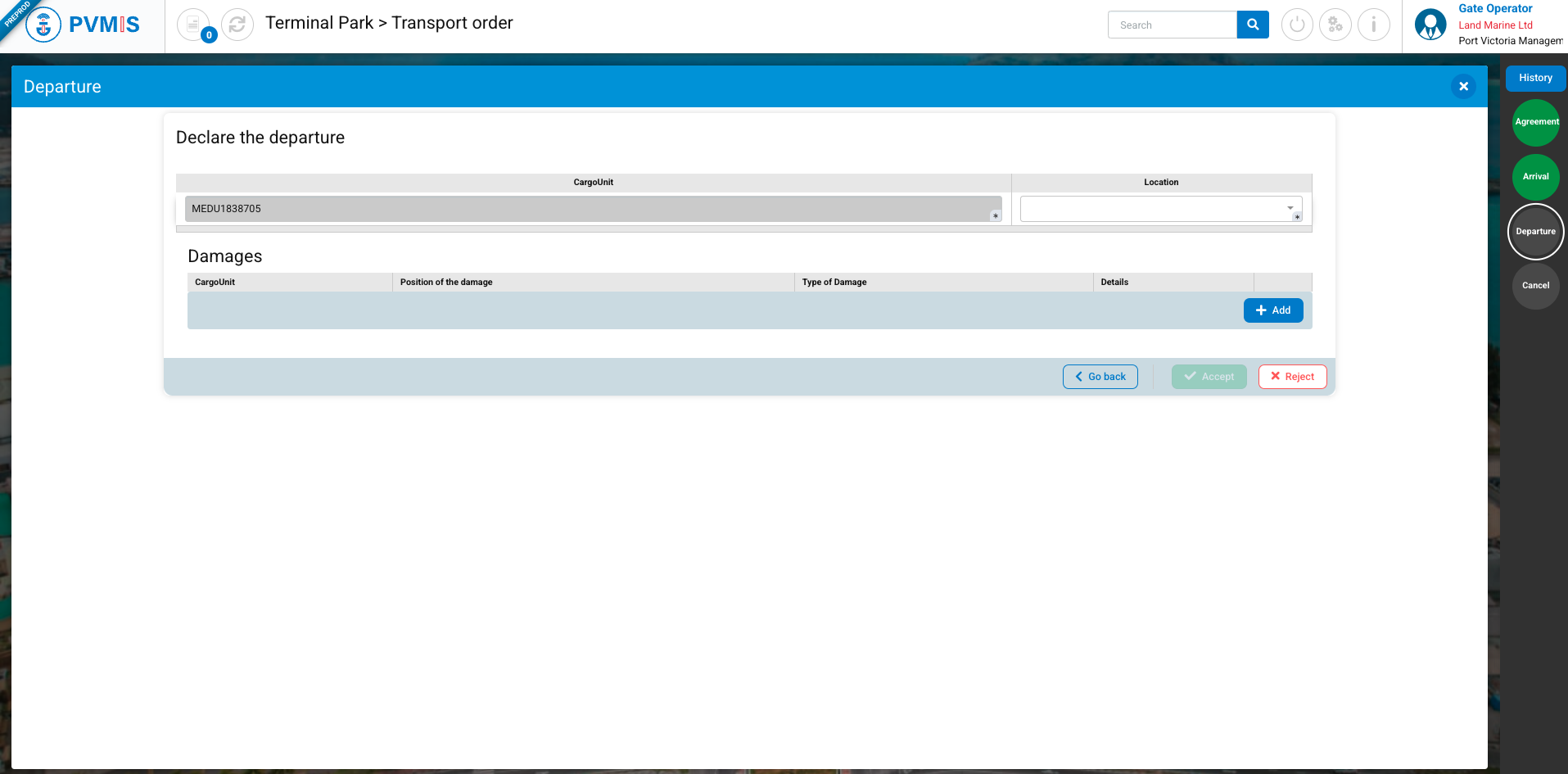 Description | As a gate operator, you are responsible for declaring the handled goods/units entering and exiting the terminal. When a transport exits the terminal, the gate operator is responsible for indicating the departure of the carrier for a "Empty container acceptance (IMPORT)" transport order type and and confirm the return to the terminal of the empty containers selected on the arrival declaration form. |