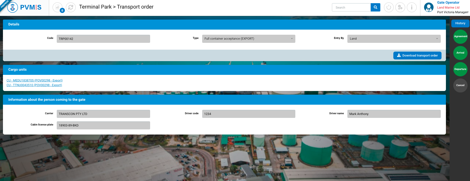 Connected as a Gate operator, click on Transport orders menu in Terminal Park section.