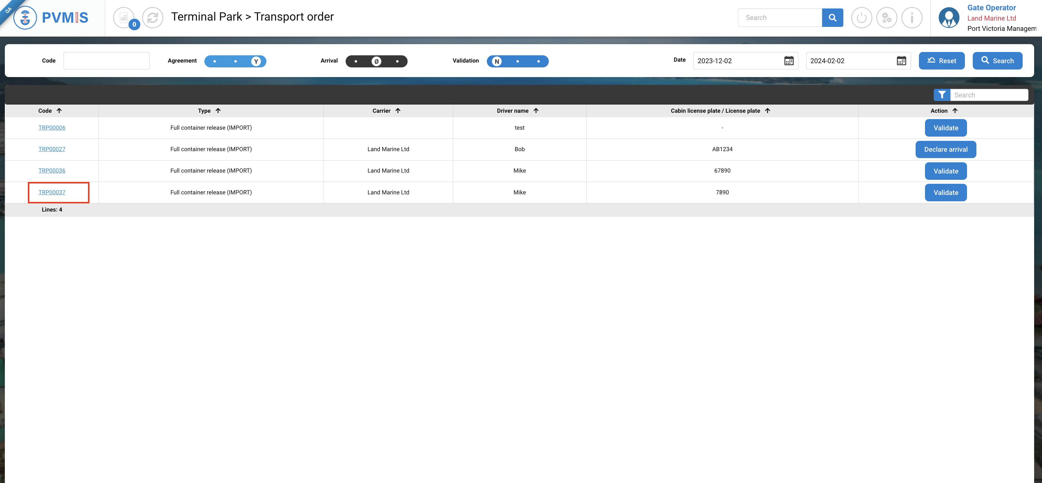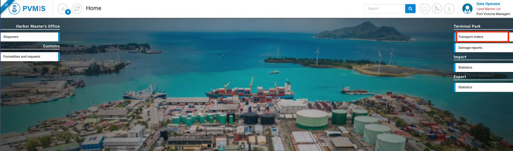 To validate the truck’s exit, go to the transport order. Click on the Transport orders menu in Terminal Park section.