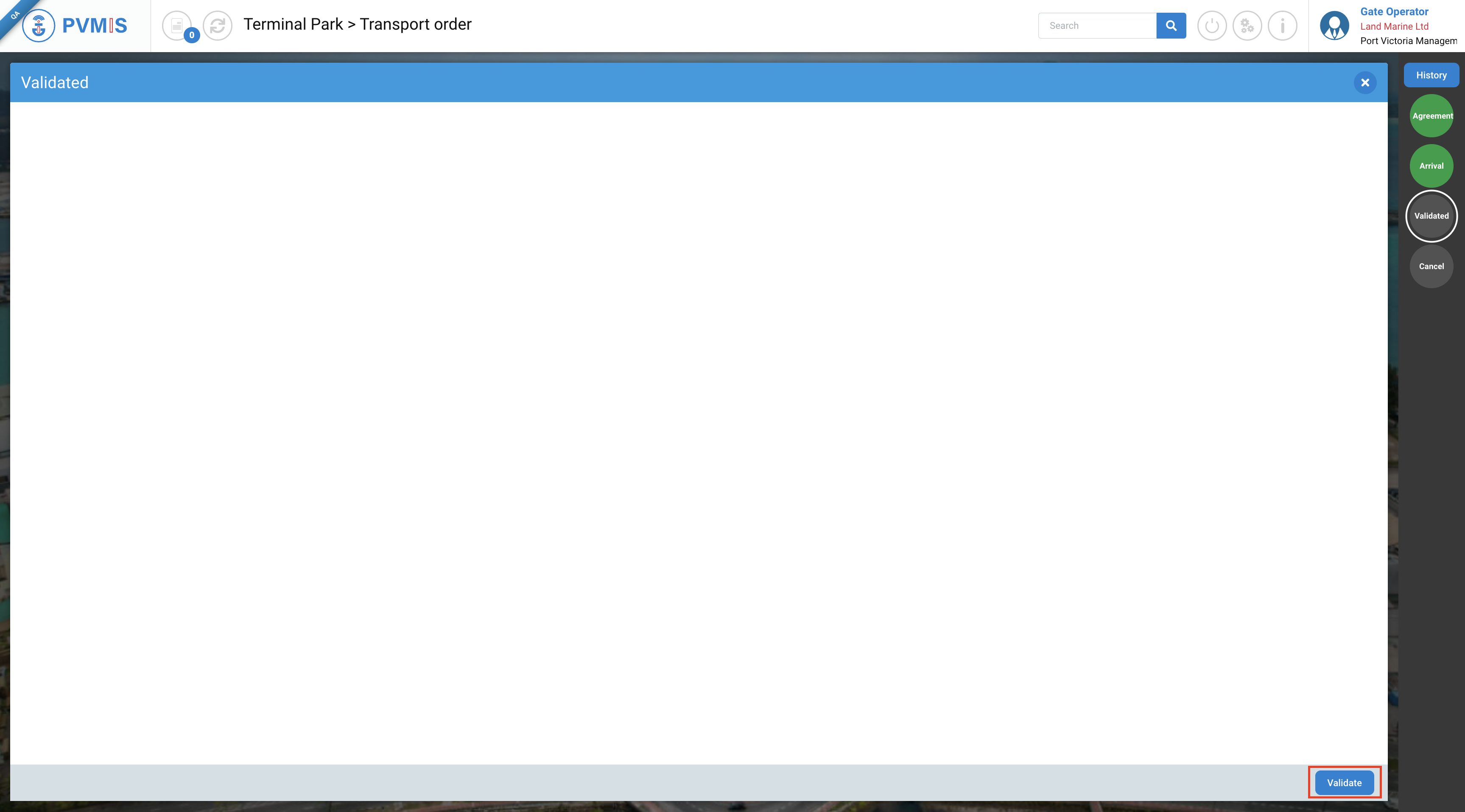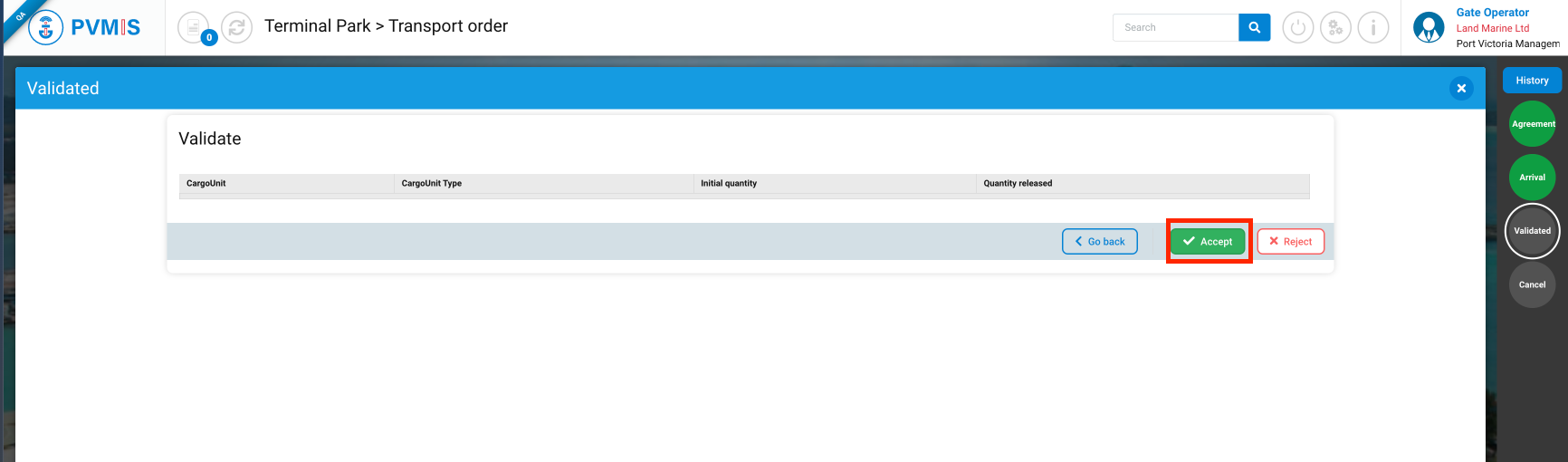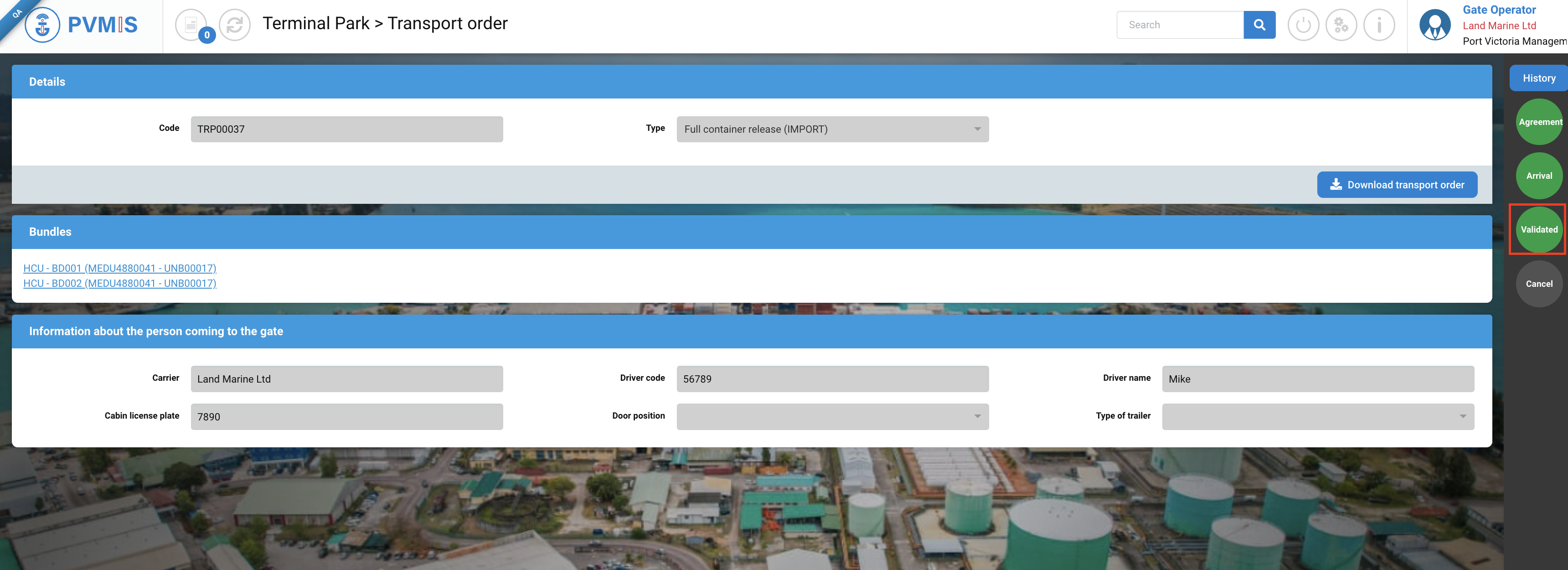 When the carrier has loaded his truck with the bundles, a gate operator can declare his departure from the port and therefore the exit of the goods.