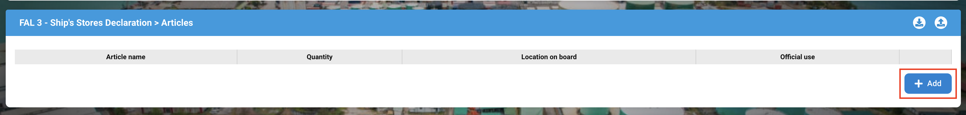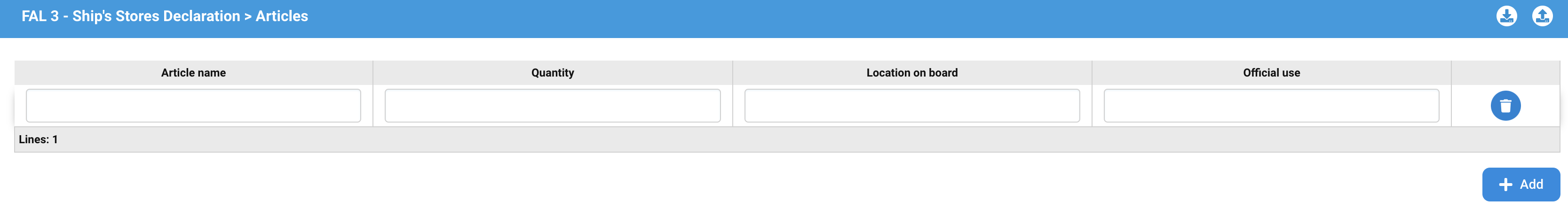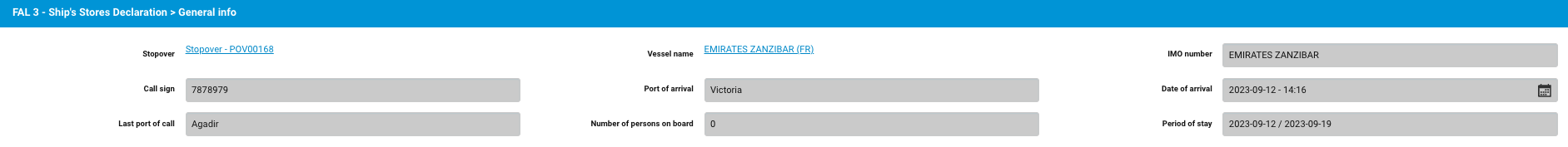 The FAL 3 is the Ship’s Store Declaration. Most of the required information comes from the stopover data and from previous FAL forms. The ship’s store article are then added manually.