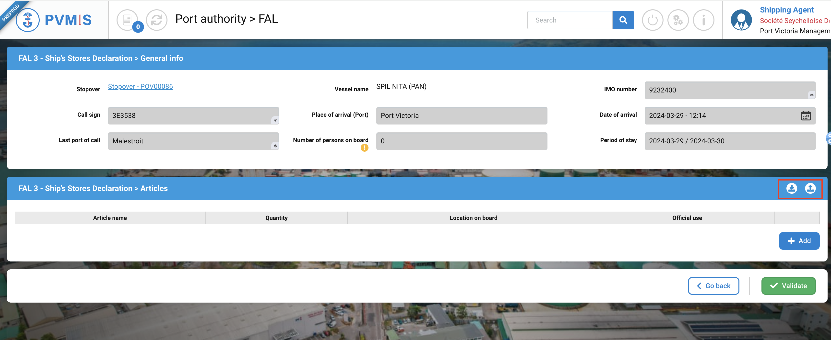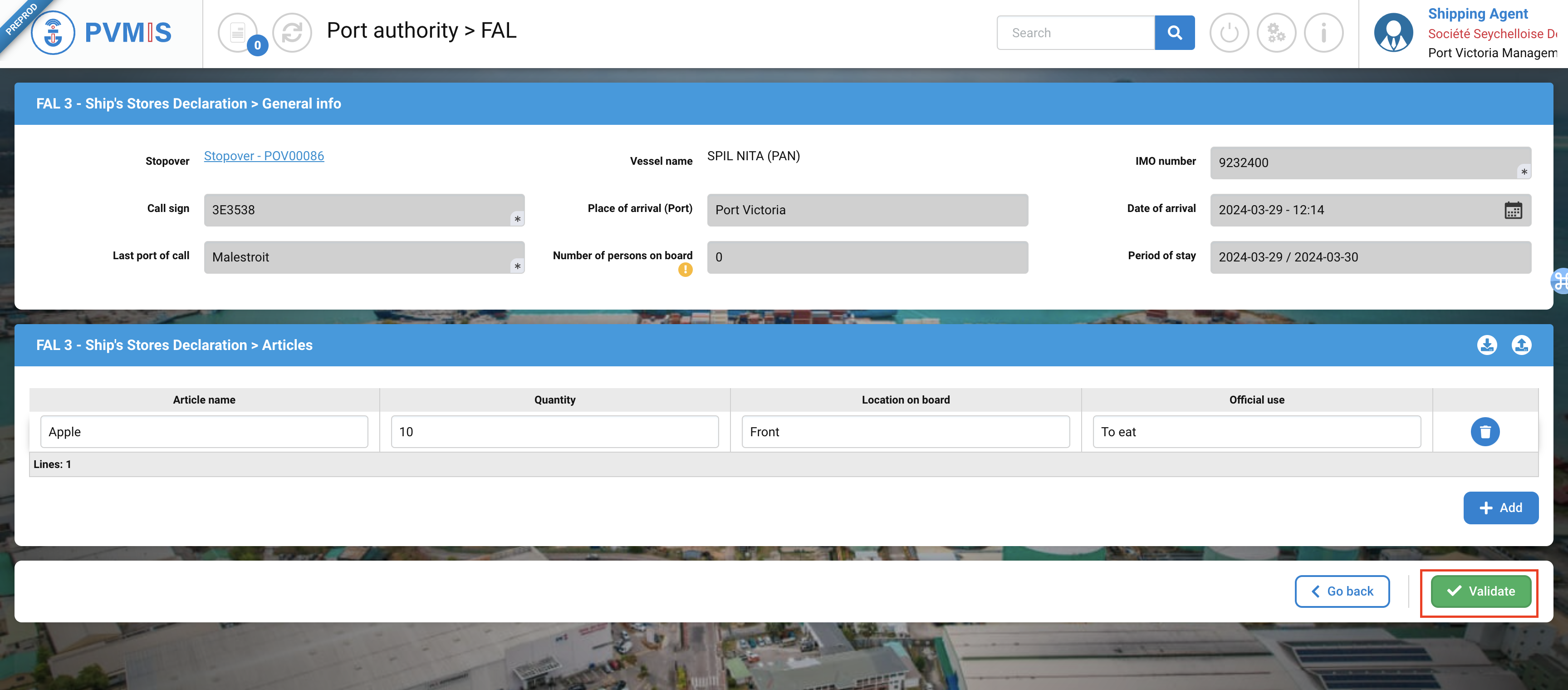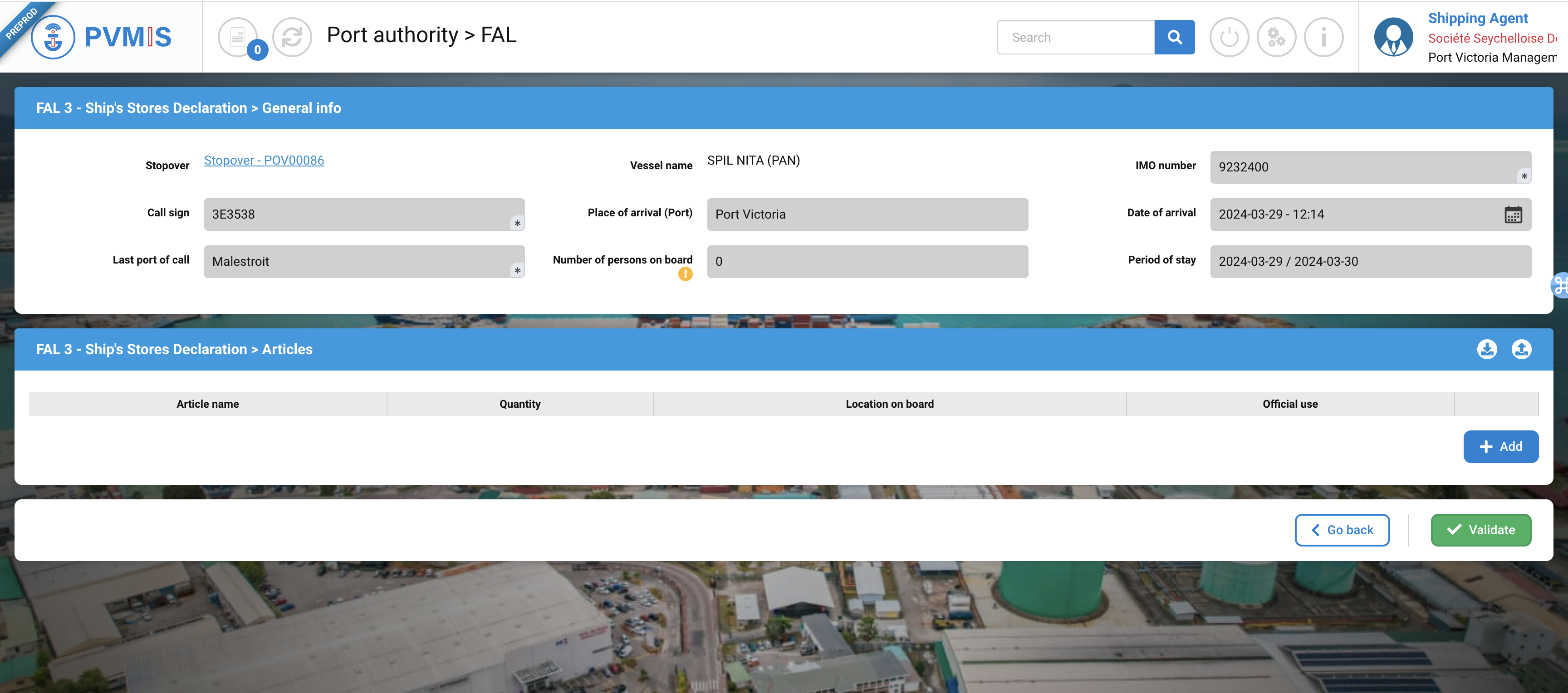 The FAL 3 is the Ship’s Store Declaration. Most of the required information comes from the stopover data and from previous FAL forms. The ship’s store article are then added manually.