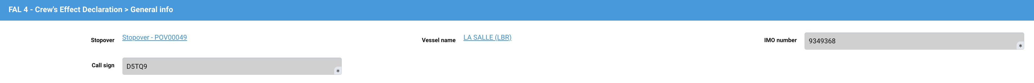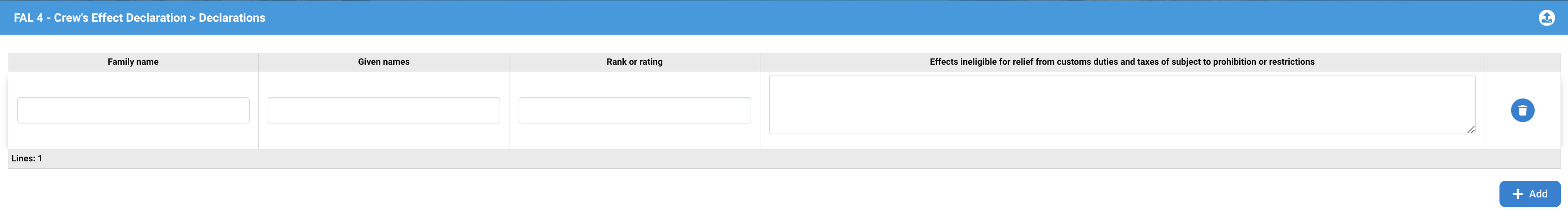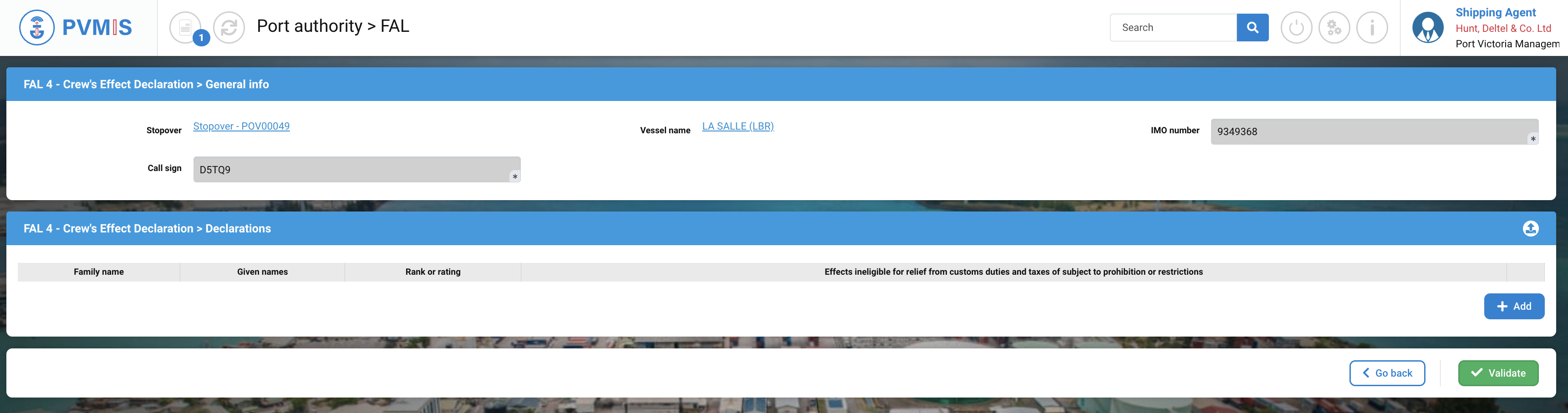 The FAL 4 is the Crew’s Effects Declaration. Most of the required information comes from the stopover data and from previous FAL forms. The ship’s store article are then added manually.